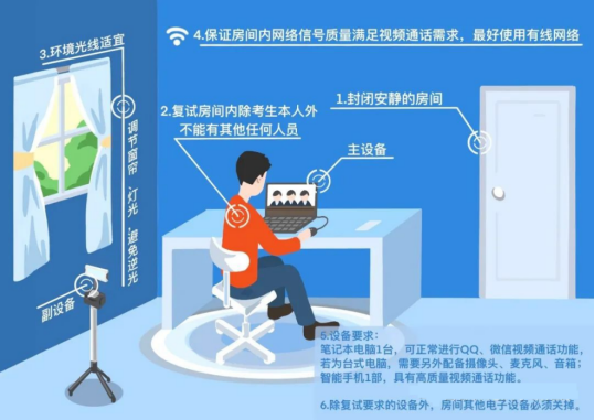 (1)考生须提前确定适于复试的封闭、安静的复试场所,室内应保持干净整洁,背景和桌面无杂物,光线充足,除草稿纸和必要的证件外,不得摆放其他物品。房间内除考生本人不能有其他人员。周围环境不得对复试产生干扰。