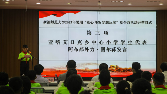感受到新疆师范大学领导老师们的温暖叮嘱和热情期盼,亚喀艾日克乡中心小学学生阿布都外力·图尔荪在发言中激动地说:“非常感谢新疆师范大学各位领导和老师,给我们提供了这次宝贵的学习机会,我们承诺在夏令营期间一定会努力提高国家通用语言文字水平和综合素质,明确自己的目标和使命,怀揣梦想,奋勇前行,用优异的成绩来回报一直关心爱护我们的领导、老师和家人。”