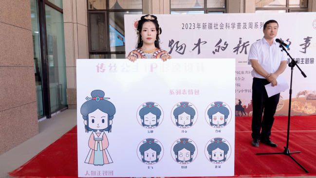“文物中的新疆故事”主题展主创团队代表、国家民委新疆师范大学中华民族共同体研究基地副主任严学勤介绍了展览设计思路。严学勤表示,本次展览设计主要突出三个特点,即深入挖掘文物背后背景讲好讲活新疆故事,挖掘新疆唐服特色制作创意IP和打卡板等。介绍中,严学勤现场向参加开幕式的观众展示了主题展“新疆唐服”、创意IP张骞和传丝公主的IP设计。