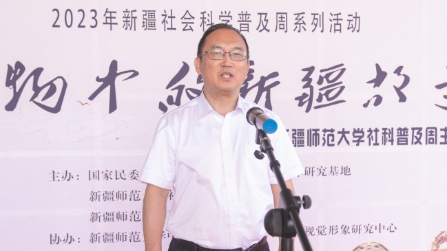 7月3日下午,2023年新疆社会科学普及周系列活动之“文物中的新疆故事”新疆师范大学社科普及展开幕式在我校温泉校区笃学楼一楼举行。自治区社会科学界联合会主要领导、自治区民委(宗教事务局)领导、自治区党委统战部领导等参加了开幕式,新疆师范大学主要领导及部分学院教师和学生代表出席开幕式。新疆师范大学党委常委、统战部部长关明主持开幕式。