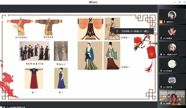 在汇报会中,历史与社会学院学生以“穿越千年赏繁华”“黄河非遗耀古今”“跨越时空为相见”“文明先声传千年”四个主题讲述了位于新疆的尼雅遗址相关故事、黄河流经九个省蕴含的历史文化、敦煌莫高窟壁画历史遗迹以及龟兹壁画等中华优秀传统文化;美术学院学生讲述非遗文化“剪纸”,号召学生增强专业传承文化的使命感;物理与电子工程学院学生讲述甲骨文的发现历程;国际文化交流学院组织学生在线参观皮影数字博物馆感受非遗魅力;中国语言文学学院学生结合古人精妙的语言艺术讲述古琴制作工艺等;音乐学院学生讲述中国民族乐器的类型和表演形式、分享国粹京剧的发展情况;地理科学与旅游学院学生讲述中国传统服饰文化;预科教育学院结合开设的《中华文化体验课》向新生介绍“泥塑”工艺;体育学院学生分享暑假期间担任枣庄市博物馆讲解志愿者的感受和成长;数学科学学院以河南卫视《唐宫夜宴》等文化巨作为切入点,讲述如何用现代技术手段让文物“活”起来,让中华文化的传承工作进一步强起来。