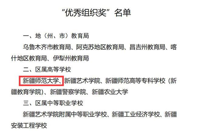 8月14日至18日,第四届中华经典诵写讲大赛新疆赛区“诵读中国”经典诵读大赛经由主办方新疆维吾尔自治区教育厅完成评审并进行获奖名单公示。本次大赛经全区各地各高校申报、各级教育行政部门逐级审核、自治区教育厅组织专家评审,在千余件作品中评选出获奖作品150件、“优秀指导教师奖”78个、优秀组织奖14个。我校经前期组织校级比赛和评选,报送诵读作品115件,最终获一等奖3项、三等奖1项,5人获“优秀指导教师奖”,学校获“优秀组织奖”。