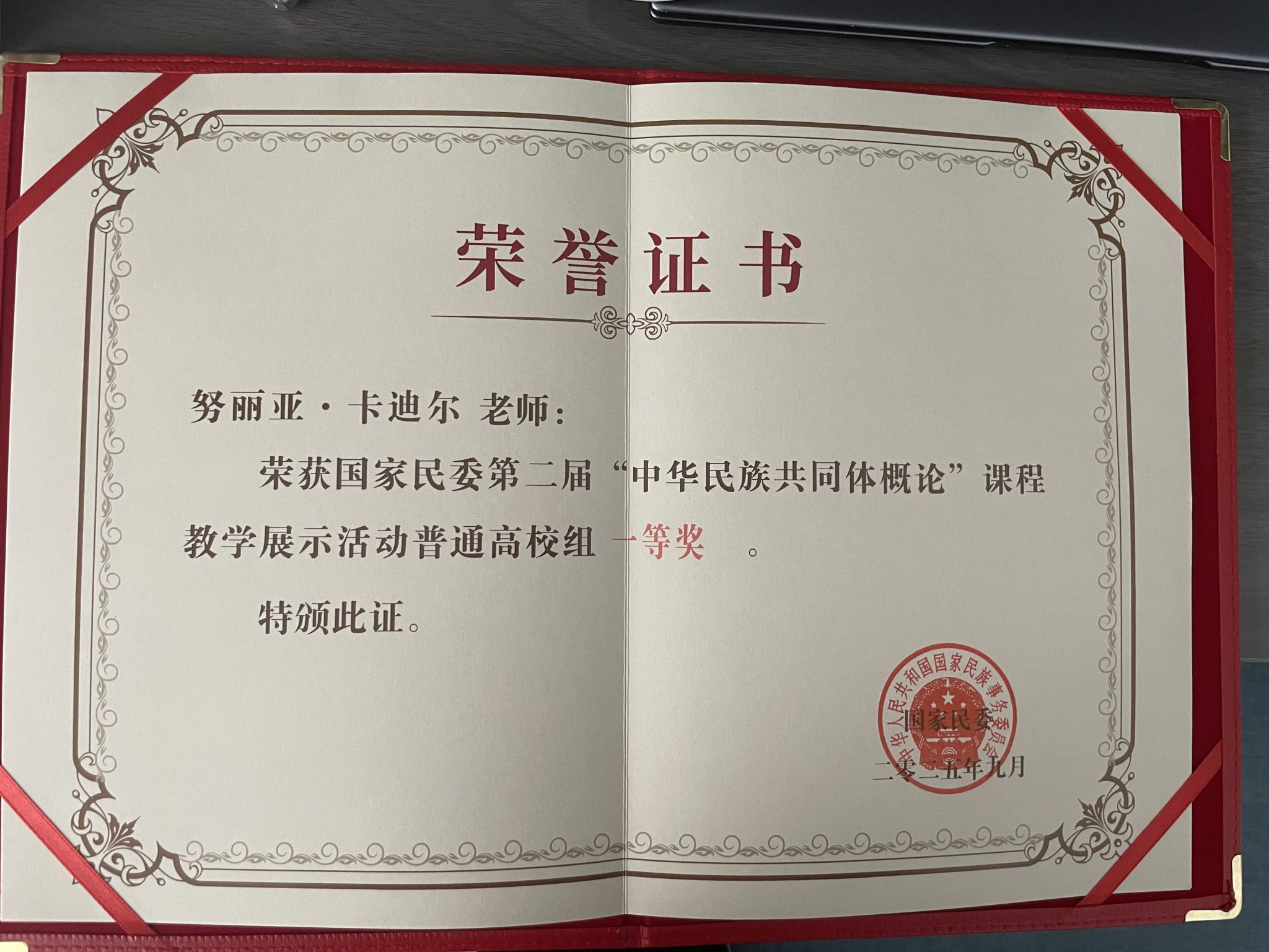 近日,由国家民委主办、教育部协办,中南民族大学与高等教育出版社联合承办的第二届《中华民族共同体概论》课程教学展示活动在湖北武汉圆满落幕。我校马克思主义学院教师努丽亚・卡迪尔凭借过硬专业素养与创新教学设计,在全国525所高校767名教师的激烈角逐中突围,成功斩获普通高校组一等奖,亦是此次赛事中新疆高校的唯一一等奖。