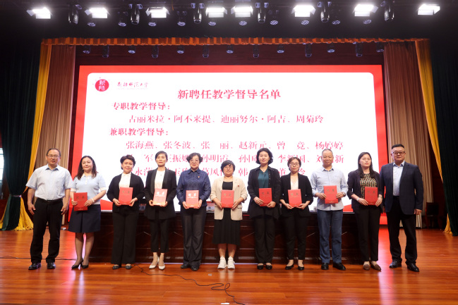 会上,刘俊宣读了学校2024年教学督导聘任文件,参会校领导为23位新聘任的专兼职教学督导颁发了聘书并合影。教育科学学院教师热孜万·阿巴斯代表新聘任的教学督导进行表态发言。她表示教学督导工作责任重大、使命光荣,今后要将“求知、力行、提效”作为督导工作的重要支点,努力做一名称职的教学督导。陈彤对受聘的新任教学督导心系学校、强师爱生、赤诚奉献的精神表示感谢。同时要求教学督导们深入课堂、了解教学;注重实效、提升质量;积极创新、推动改革;树立榜样、贡献力量。希望全体教师在学校发展建设的关键之年,统一思想、凝聚共识,为学校教育教学改革发展做出更大的贡献。