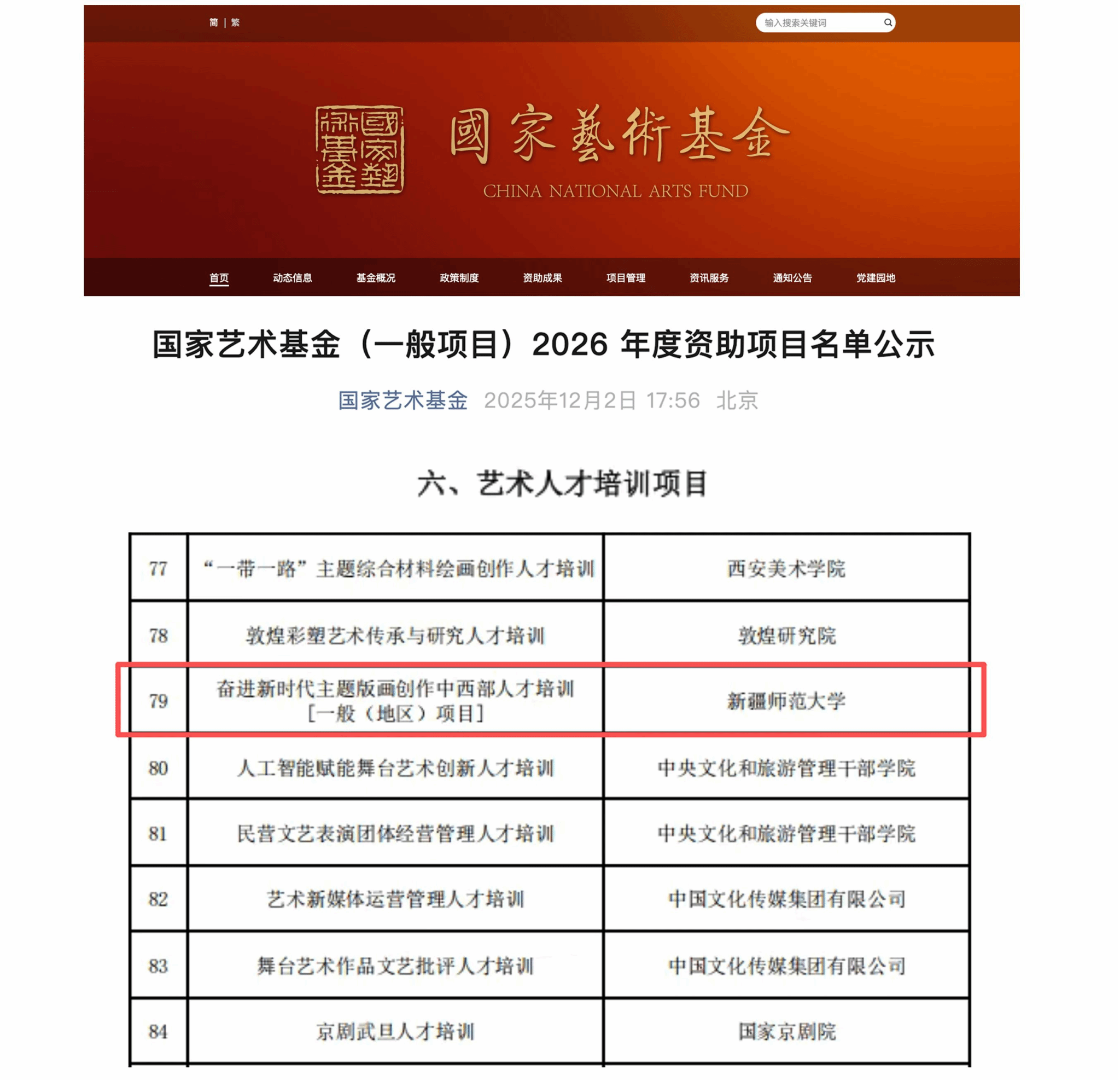 我校此次立项项目由美术学院申报,均为本年度国家艺术基金同类项目中新疆地区唯一获批项目,既是对学校艺术学学科建设水平的认可,也是学校持续重视艺术创作人才队伍建设、不断推动艺术实践与创新的成效体现。