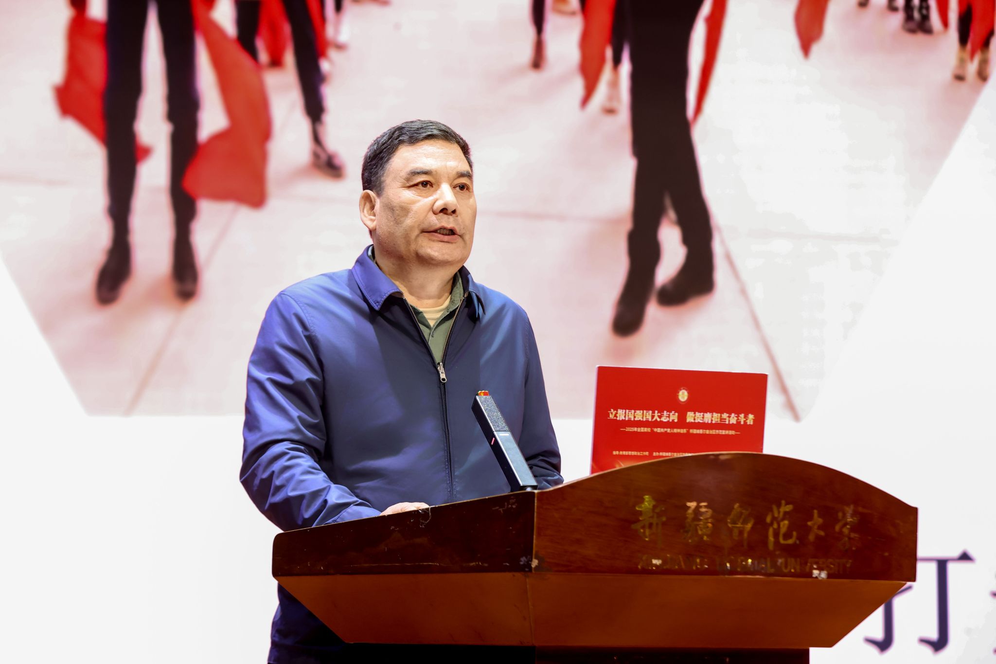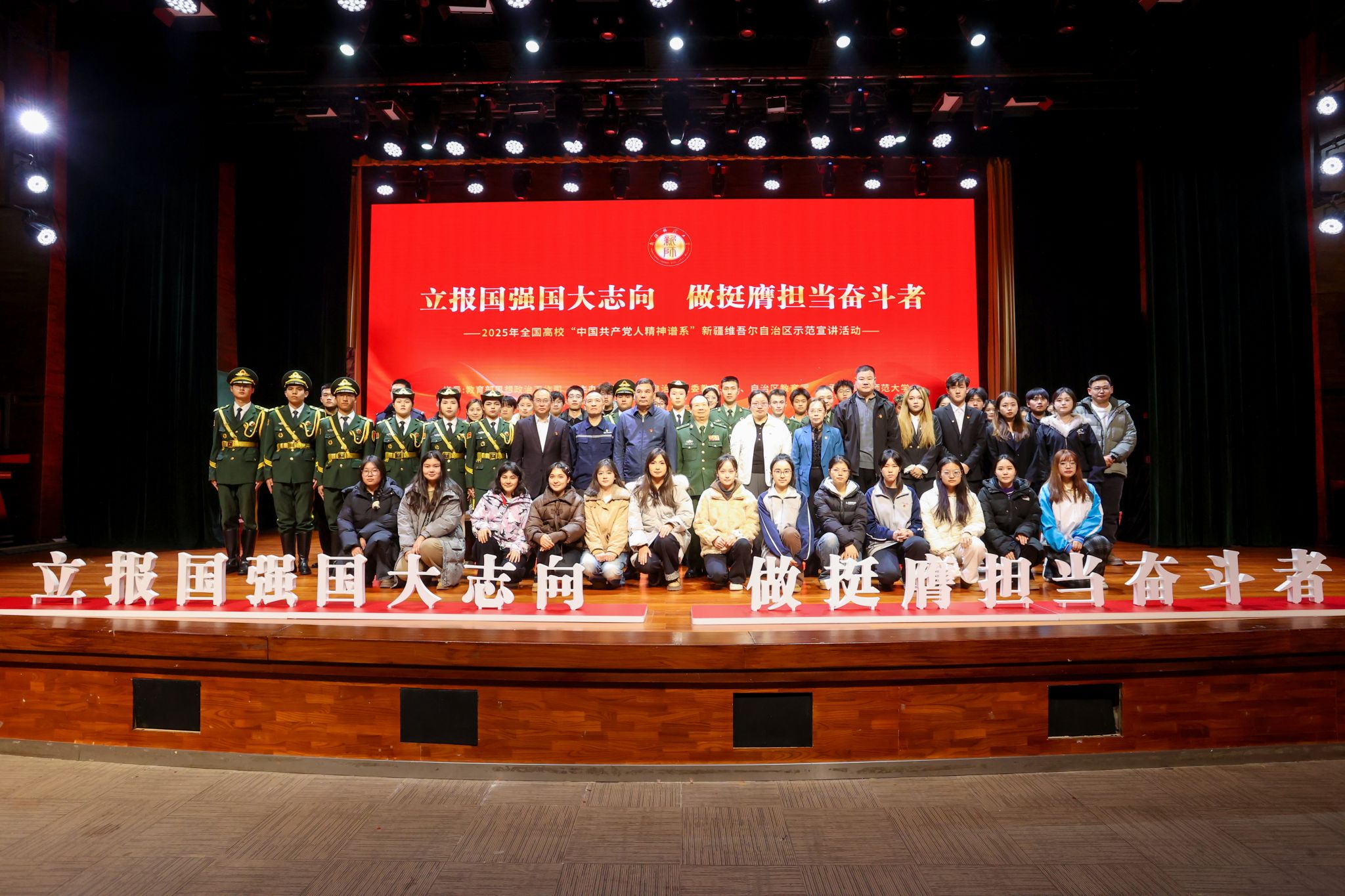 12月4日,2025年全国高校“中国共产党人精神谱系”新疆维吾尔自治区示范宣讲活动在我校温泉校区昆仑讲堂举行。活动以“立报国强国大志向,做挺膺担当奋斗者”为主题,采取“线下主会场+线上分会场”的形式开展,乌鲁木齐市高校师生代表及我校退役大学生协会、国旗班和各学院学生代表共580余人在主会场参加活动,全区各高校师生同步以视频方式在线聆听宣讲。