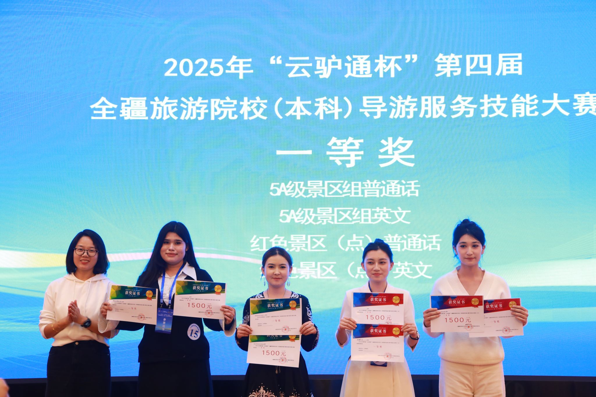 经过激烈角逐,大赛于12月6日晚举行闭幕式及颁奖典礼。裁判组代表对中文讲解、英文讲解及才艺展示赛项进行了专业点评。大会依次颁发各赛项个人奖项及优秀组织奖,来自新疆财经大学的坤杜孜阿依·艾力、新疆师范大学的阿合玛热阿勒·阿依肯、新疆天山职业技术大学的张静怡、新疆师范高等专科学校的维丽达娜·米尔孜哈买提等选手凭借出色的综合表现荣获各赛项一等奖。同时,新疆天山职业技术大学、新疆师范大学、安徽云驴通信息技术有限公司荣获优秀组织奖。同期举办的“文旅兴疆·智启十五五”校地协同赋能旅游高质量发展论坛,邀请多位专家学者围绕旅游人才培养与产业融合发展展开深入交流,进一步丰富了赛事内涵。