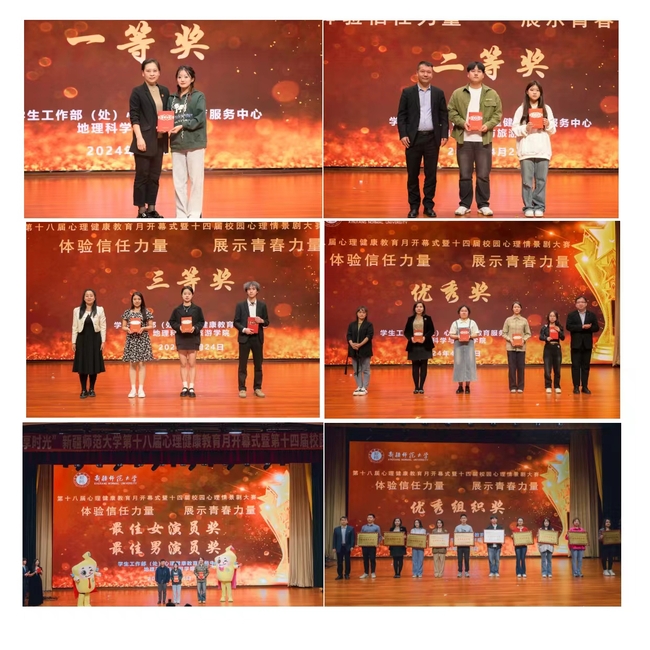 经过激烈角逐,心理学院学院剧目《不曾知道的爱》荣获一等奖;美术学院和马克思主义学院分别获得二等奖;教育科学学院,音乐学院和地理科学与旅游学院三等奖;外国语学院,体育学院,物理与电子工程学院,商学院获得优秀奖;教育科学学院学生依力哈木·依明获得最佳男演员,心理学院学生王宇新获得最佳女演员;马克思主义学院等10个学院获得优秀组织奖。