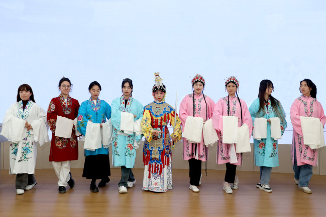 现场观众体验互动环节成为了本次活动的亮点。学生们纷纷穿戴上京剧水袖服饰和头饰,作为“模特”进行京剧服装展示,跟着专业京剧演员学身段,并在专业老师的示范、指导下舞动起长穗剑、双头枪。现场学生们不断地尝试着,与国粹艺术亲密接触。最后,王戈老师带领现场大学生们用京剧念白的方式演绎耳熟能详的古诗词,以当下年轻人最为流行和喜爱的一种学习方式,使大家深深感受到传统文化的魅力。