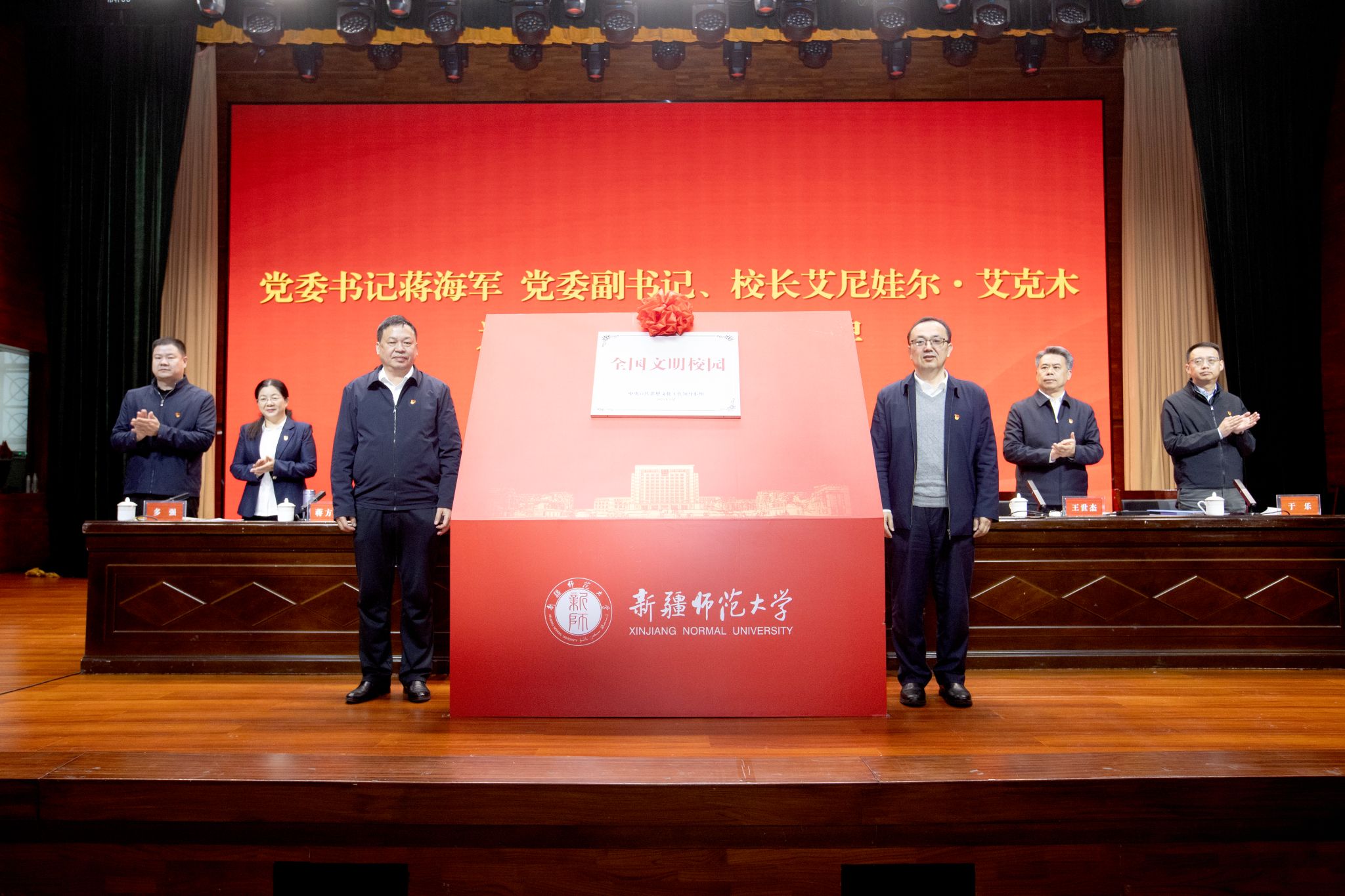 校党委书记蒋海军和校党委副书记、校长艾尼娃尔·艾克木为“全国文明校园”揭牌
