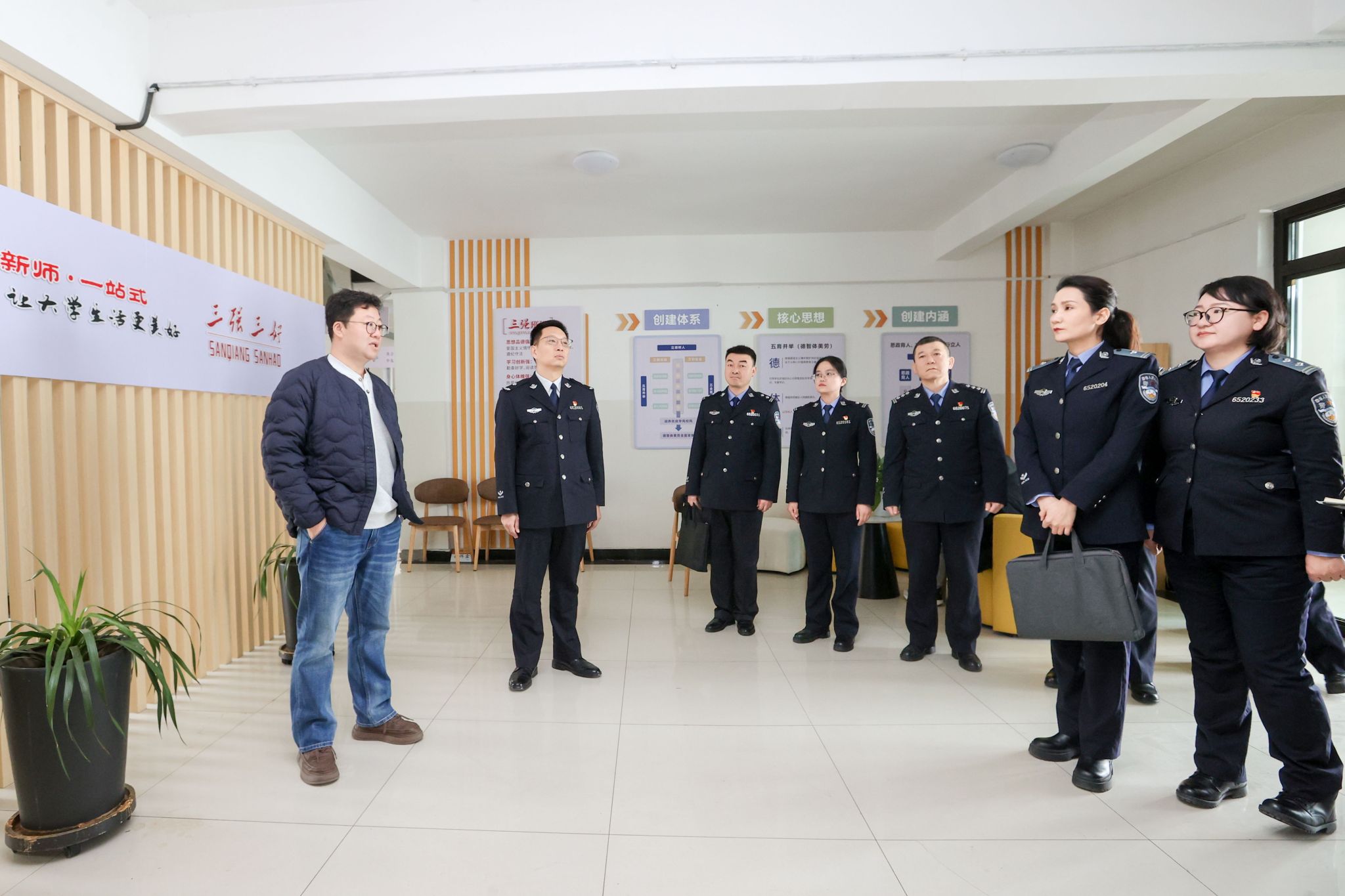 签约仪式结束后,新疆司法警官职业学院领导一行与我校相关部门负责人一同参观了“一站式”学生社区、大学生活动中心、铸牢中华民族共同体意识教育实践基地(美育浸润实践基地)等场所。