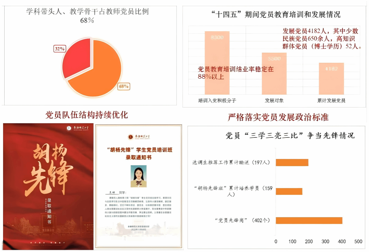 严格落实党员发展政治标准,坚持把政治标准放在首位,五年来累计发展党员4182人,其中少数民族党员650余人、高知识群体(博士学历)党员52人,党员队伍结构持续优化。深入实施“青年马克思主义者培养工程”,学生党员占比始终保持在 95%以上,教师党员中学科带头人、教学骨干占比提升至68%,让优秀人才向党组织靠拢。构建“5+1”党员教育培训体系,分层分类开展教育培训,累计培训入党积极分子8300余人次、发展对象5500余人次,党员教育培训结业率稳定在88%以上,党员思想政治素质和业务能力全面提升。
