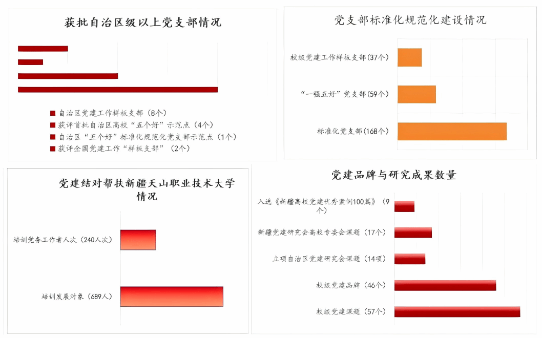 坚持抓基层、强基础、固基本,全力推进党支部标准化规范化建设,截至2025年,全校168个党支部全部完成标准化建设,基层党组织组织力、凝聚力、战斗力显著增强。其中59个党支部获评“一强五好”党支部,创建自治区党建工作样板支部8个、校级党建工作样板支部37个;1个党支部被命名为自治区“五个好”标准化规范化党支部示范点,4个党支部获评首批自治区高校“五个好”示范点,2个党支部获评全国党建工作“样板支部”,形成了“立样板、树标杆、带整体”的良好格局。