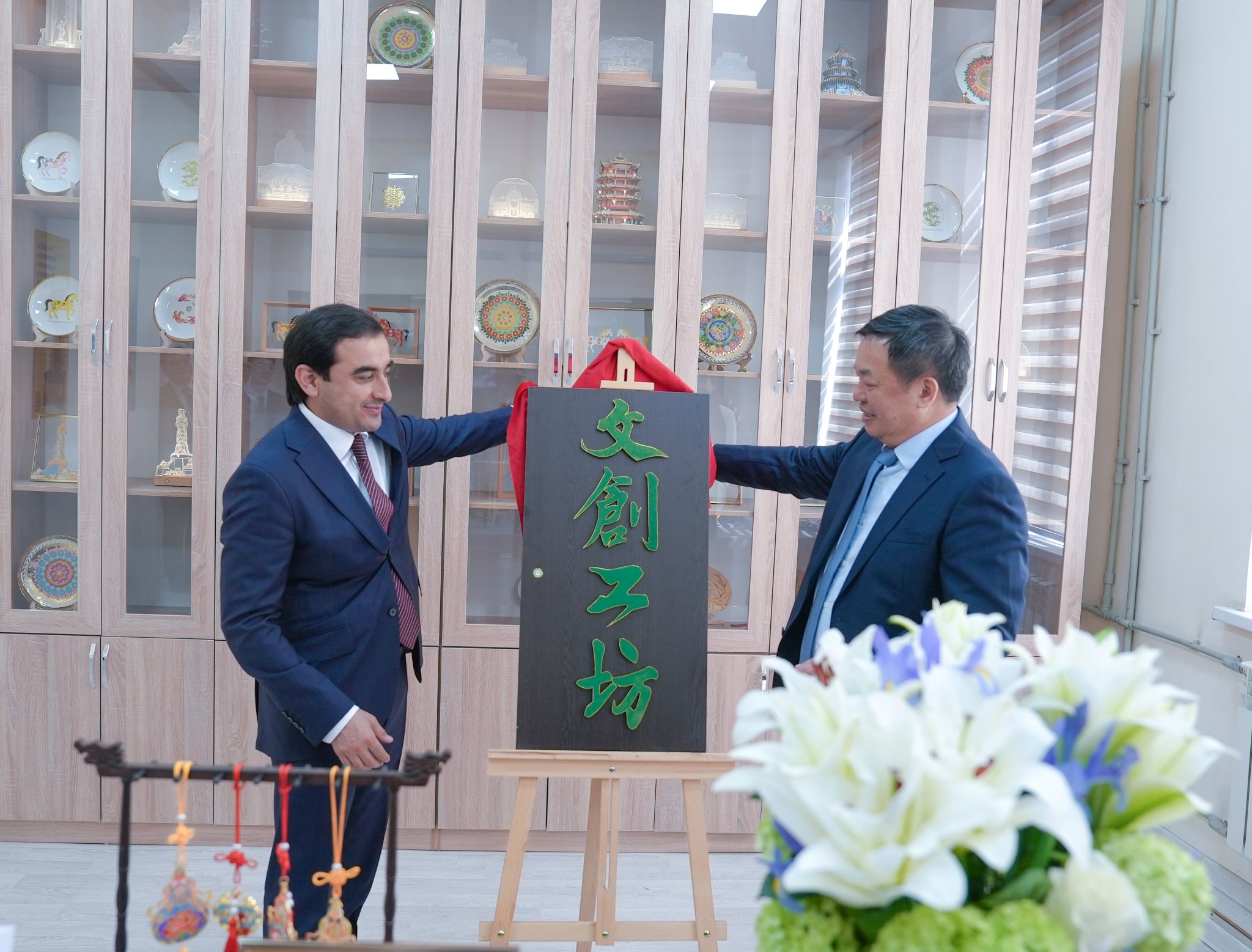 塔吉克斯坦民族大学孔子学院文创工坊致力于挖掘中塔非物质文化遗产,通过创新与传统的结合推动文化交流,目前文创涵盖非遗、文博、旅游和生活四个领域,并计划在未来拓展更多项目。参观期间,蒋海军与塔吉克斯坦民族大学外事副校长加佛尔佐达·伊里尤斯共同为文创工坊揭牌,标志着该文化交流平台正式启用。