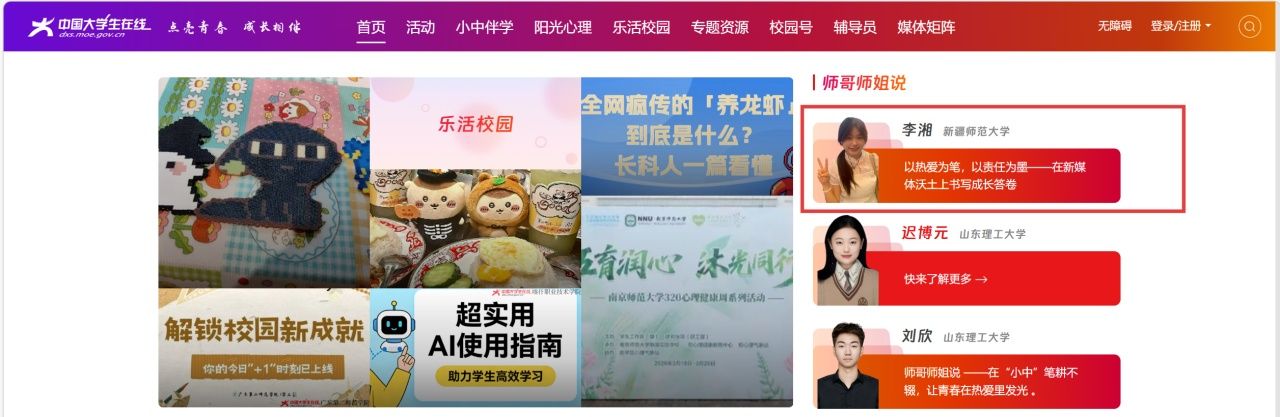 教育部中国大学生在线平台“师哥师姐说”栏目页