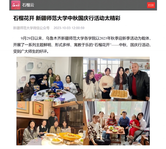 9月29日以来,乌鲁木齐新疆师范大学各学院以2023年秋季迎新季活动为载体,开展了一系列主题鲜明、形式多样、寓教于乐的“石榴花开”——中秋、国庆行活动,受到广大师生的好评。