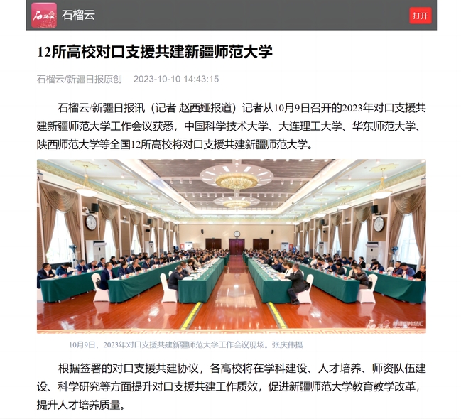 石榴云/新疆日报讯(记者 赵西娅报道)记者从10月9日召开的2023年对口支援共建新疆师范大学工作会议获悉,中国科学技术大学、大连理工大学、华东师范大学、陕西师范大学等全国12所高校将对口支援共建新疆师范大学。
