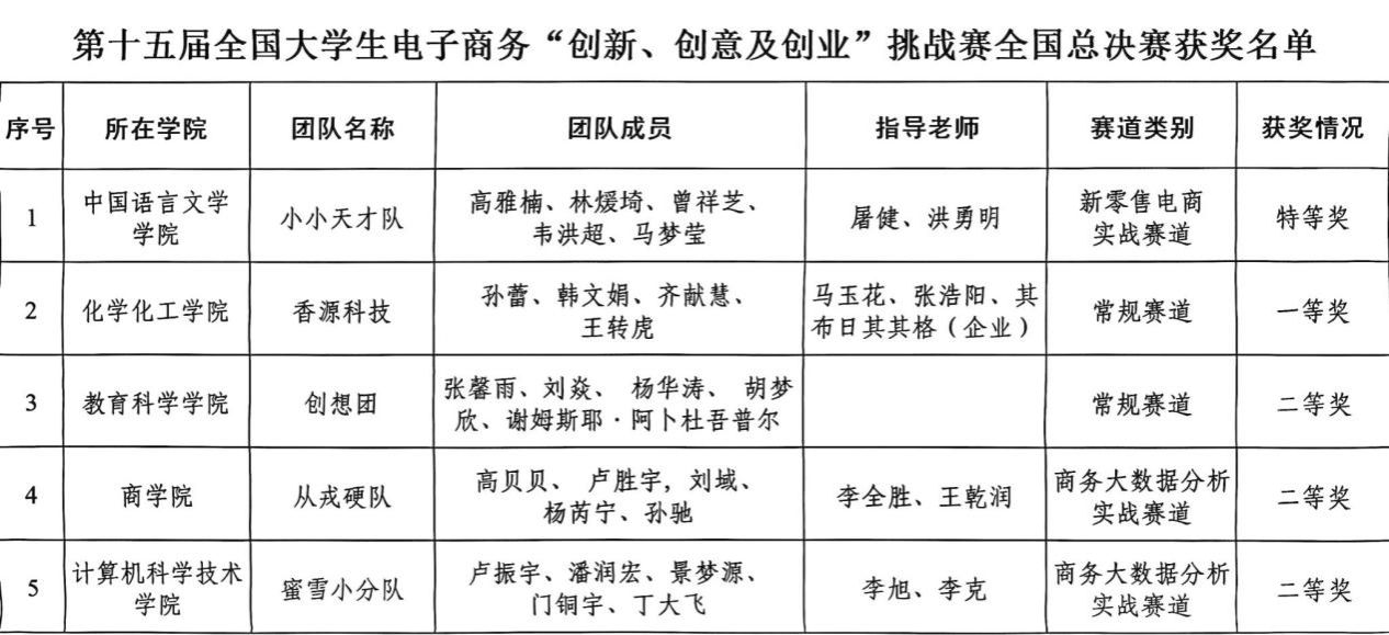 近日,第十五届全国大学生电子商务“创新、创意及创业”挑战赛全国总决赛圆满落幕。我校5支晋级国赛的团队分别斩获特等奖1项、一等奖1项、二等奖3项,刷新我校在该项赛事全国总决赛中的历史最好成绩。