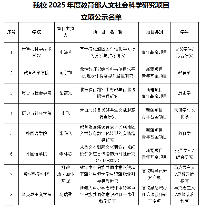 近日,教育部对2025年度教育部人文社会科学研究一般项目、高校思想政治理论课教师研究专项的评审结果进行了公示,我校共有8个项目进入公示名单,项目总数在区内各高校中排名领先。