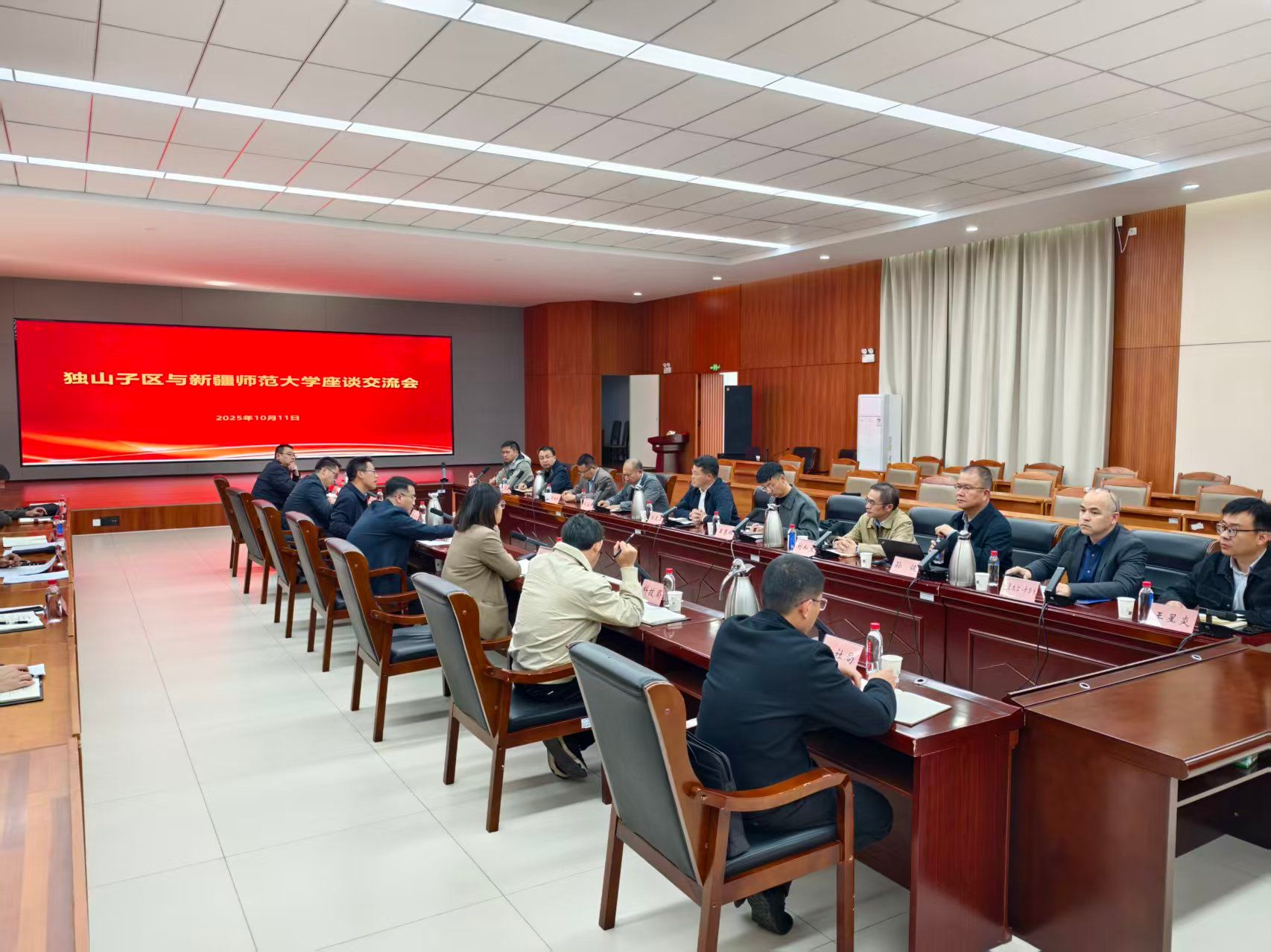 当天下午,考察组一行前往独山子区调研。独山子区相关领导结合当地工业基础雄厚、文旅资源丰富的发展特点,介绍了区域在油助剂研发、污水处理、文化旅游等领域的发展需求与规划,以及对教育数字化升级、教师队伍建设的重视。双方围绕多领域合作展开深入交流,各学院结合区域需求明确合作重点,现场初步敲定合作对接时间表。