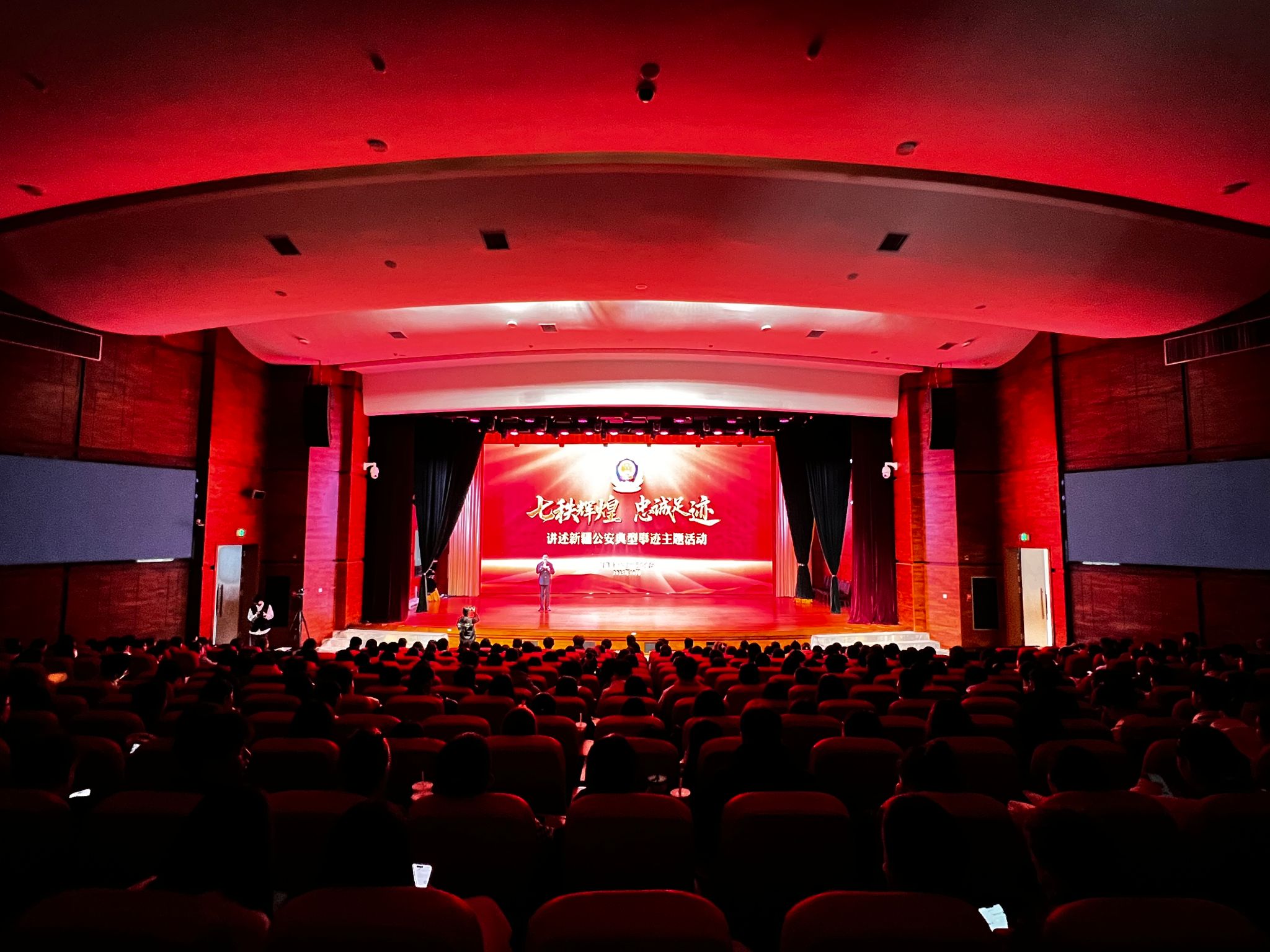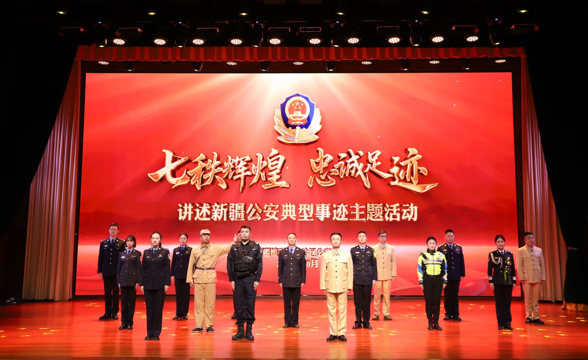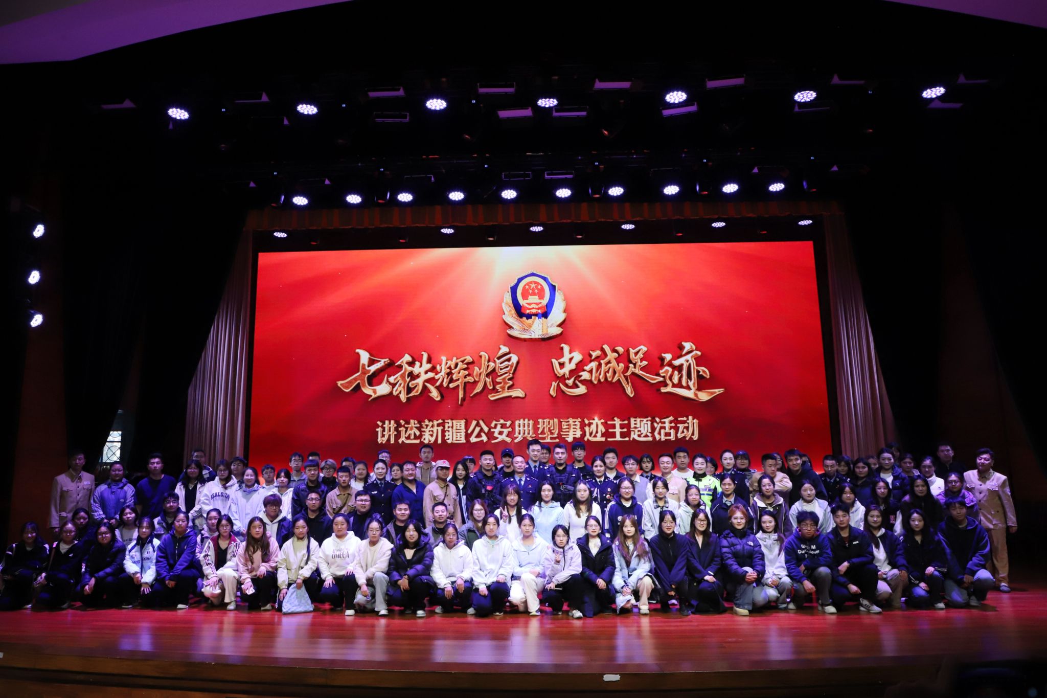 整场活动以新疆维吾尔自治区成立70周年为主线,以公安英模的感人故事为素材,生动呈现新疆公安70年发展历程。活动分为“孕育而生”“峥嵘岁月”“忠诚奋进”“薪火相传”四个篇章,将纪实影像、情景演绎、现场讲述与舞台艺术深度融合,全景展现了从新疆公安开创之初的艰辛探索,到峥嵘岁月里的无畏牺牲,再到和平年代里守护平安的坚定执着,让现场师生深刻感受到新疆公安与人民同频、与时代共振的奋斗征程,以及“人民公安为人民”的铮铮誓言。