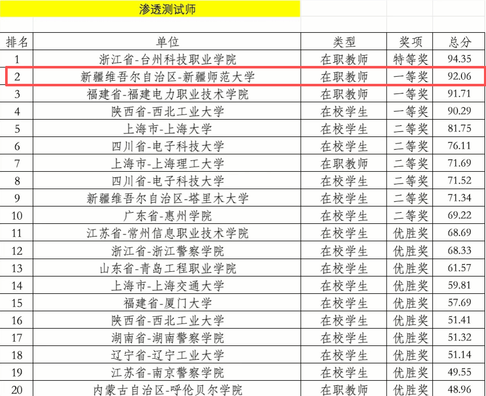 近日,2025年高校网络安全管理运维赛暨全国网络安全行业职业技能大赛(教育赛道)决赛在上海交通大学落下帷幕。我校信息管理中心(网信办)薛辰老师凭借深厚的理论积淀与精准的实战能力,从全国704家教育行政单位及高校的2246名师生中脱颖而出,斩获渗透测试员赛项一等奖(总成绩排名第二),并成功晋级,获得参加2025年全国网络安全行业职业技能大赛全国总决赛的资格。这也是新疆高校师生在该赛事中获得的最高成绩。