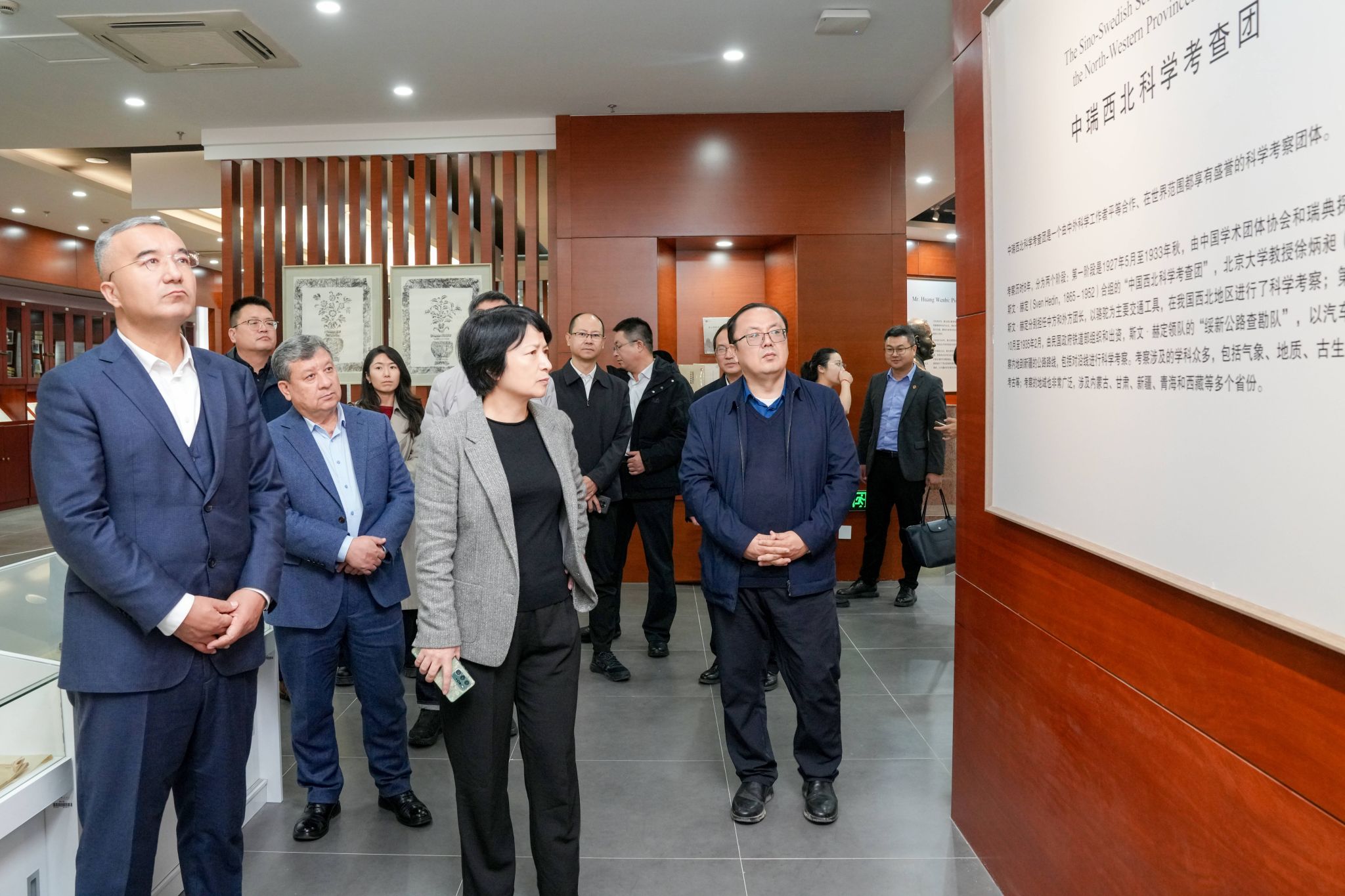随后,梅兵一行参观了我校黄文弼中心,查看了黄文弼亲属捐赠的文献、历史照片及手稿等珍贵资料,深入了解《楼兰考古调查与发掘报告》遗稿整理出版等成果。中心主任吴华峰介绍了近年来中心在文物保护、学术研究及专题展览等方面的工作成效。梅兵指出,黄文弼先生的学术精神与西域研究成果,是中华文化多元一体的生动体现,华东师范大学愿与我校加强文献整理、跨学科研究及研究生联合培养等领域的深度合作,助力中心打造西北边疆文化研究的核心平台。