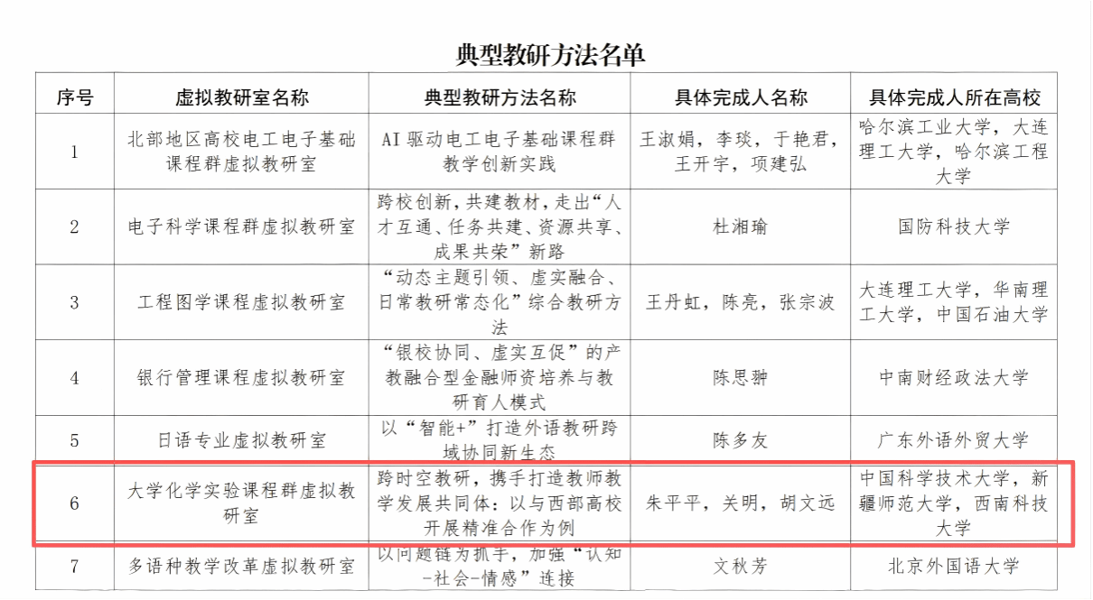 近日,教育部高等教育司与虚拟教研室项目秘书处联合发布了《关于公布2025年度虚拟教研室试点建设典型名单的通知》,我校关明教授参与建设的“大学化学实验课程群虚拟教研室”凭借其创新性与实效性,成功入选全国典型教研方法名单。