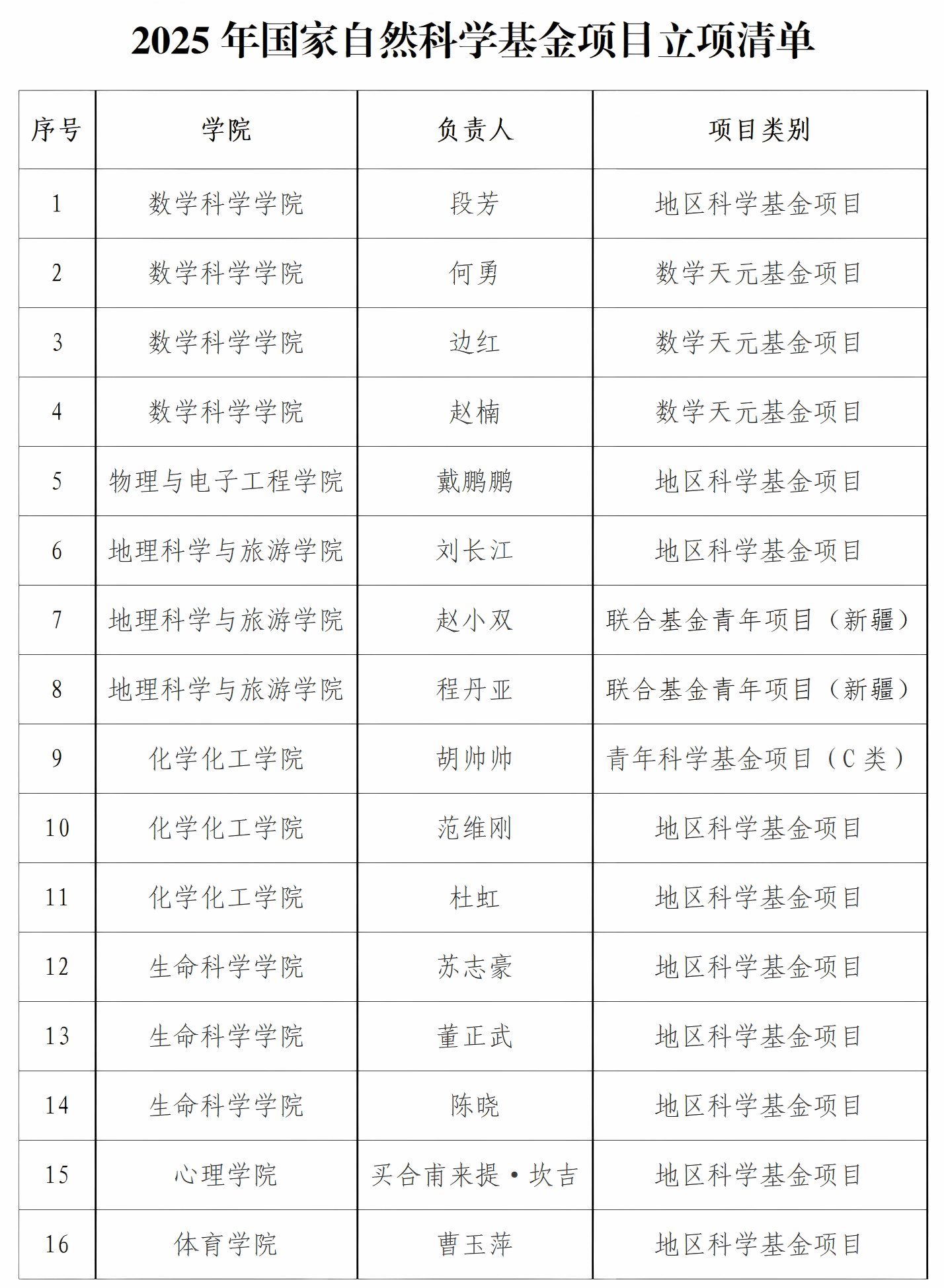 近日,国家自然科学基金委员会公布 2025 年度数学天元基金项目评审结果,我校喜获 3 项立项。截至目前,我校2025年度累计获批国家自然科学基金项目16项,包括地区科学基金项目10项、青年科学基金项目(C类)1项、联合基金青年项目(新疆)2项、数学天元基金项目3项,涵盖数学、物理、化学、生命科学、地球科学、工程与材料科学等多个学科领域,呈现出学校科研布局的广度与持续发展的良好态势。