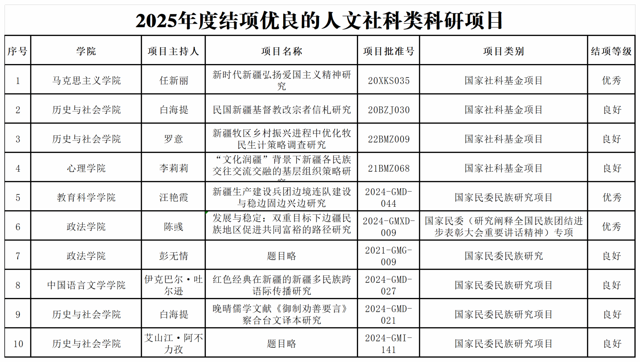 2025年,我校共有10项省部级及以上人文社科类科研项目的结项等级为优良,其中,结项优秀的有3项,结项良好的有7项,项目类型涉及国家社科基金项目、国家民委民族研究项目。
