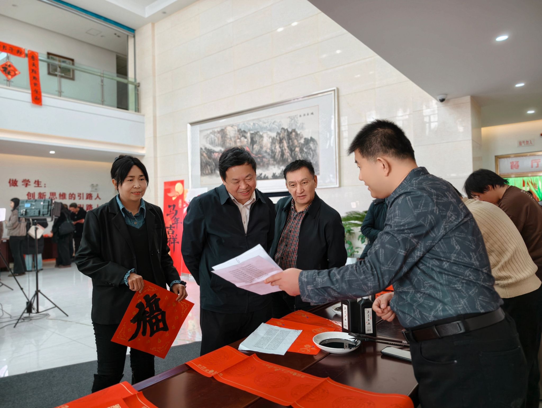 为迎接马年新春,增强教职工对中华优秀传统文化的认同感与归属感,进一步推进铸牢中华民族共同体意识教育,1月13日至14日,校工会联合我校美术学院、教育科学学院举办“墨香润校园 同心启新程”新春送福活动。校党委书记蒋海军等校领导来到现场参加活动,与老师们共迎新年。