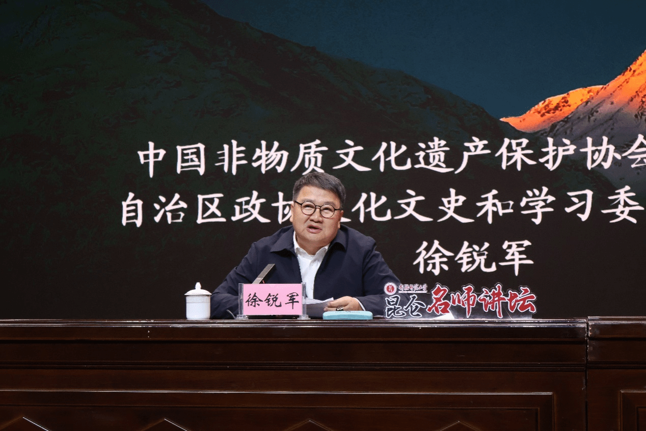 12月17日,我校“昆仑名师讲坛”第一百八十七讲在温泉校区昆仑讲堂成功举办。本次讲坛特邀自治区政协文化文史和学习委员会副主任、中国非遗保护协会副会长徐锐军进行讲座。讲座由校党委副书记刘俊主持,学校科技处负责同志、地理科学与旅游学院领导班子及师生代表共600余人聆听讲座。