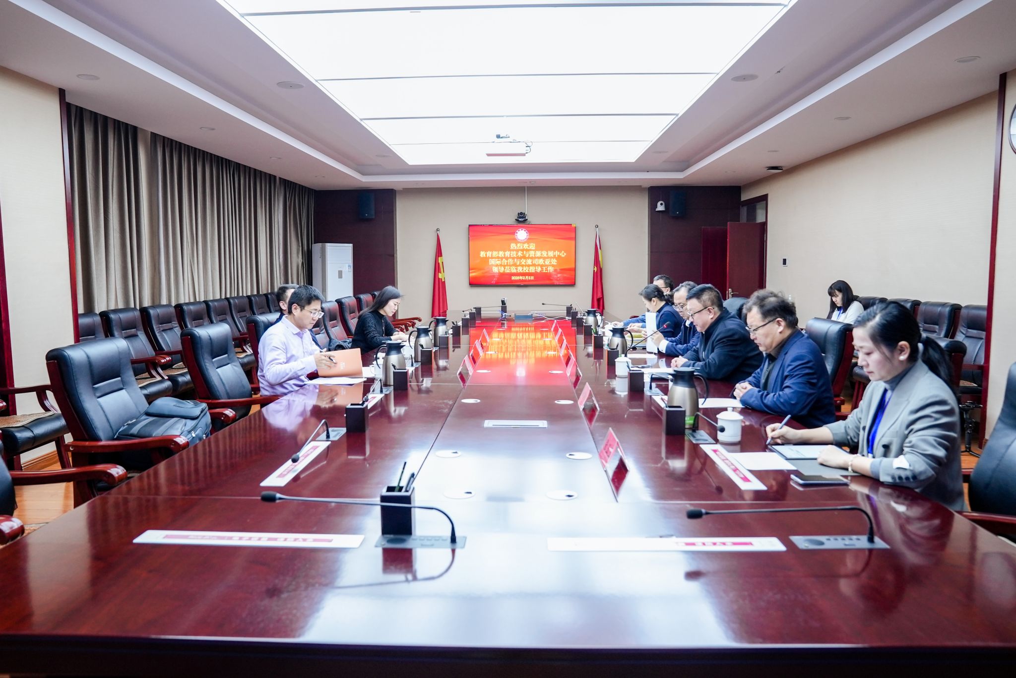 座谈中,郑志强介绍了教育部教育技术与资源发展中心的相关工作情况及此次调研指导的背景与考量,为学校数智化建设与国际合作提供了专业指导。许浙景分享了此次办班背景及教育部国际合作与交流司在欧亚地区教育合作领域的工作部署与发展方向,为学校深化中国—中亚教育合作指明了路径。陈彤代表学校,对教育部长期以来给予的支持表示诚挚感谢,特别致谢国际司对中亚学院落地及学校国际化发展的鼎力相助。