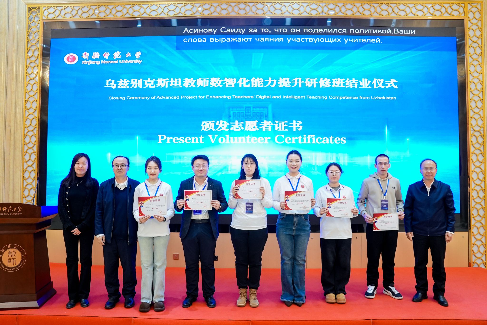 艾尼娃尔·艾克木向乌方43名学员的圆满结业表示热烈祝贺,感谢教育部及自治区教育厅等单位的倾力支持,充分赞扬学员们的学习热情与实践精神,并肯定授课专家与志愿者的辛勤付出。艾尼娃尔·艾克木强调,结业是新起点,期待学员将数智化教育成果带回乌兹别克斯坦,继续推动中乌教育交流与合作。