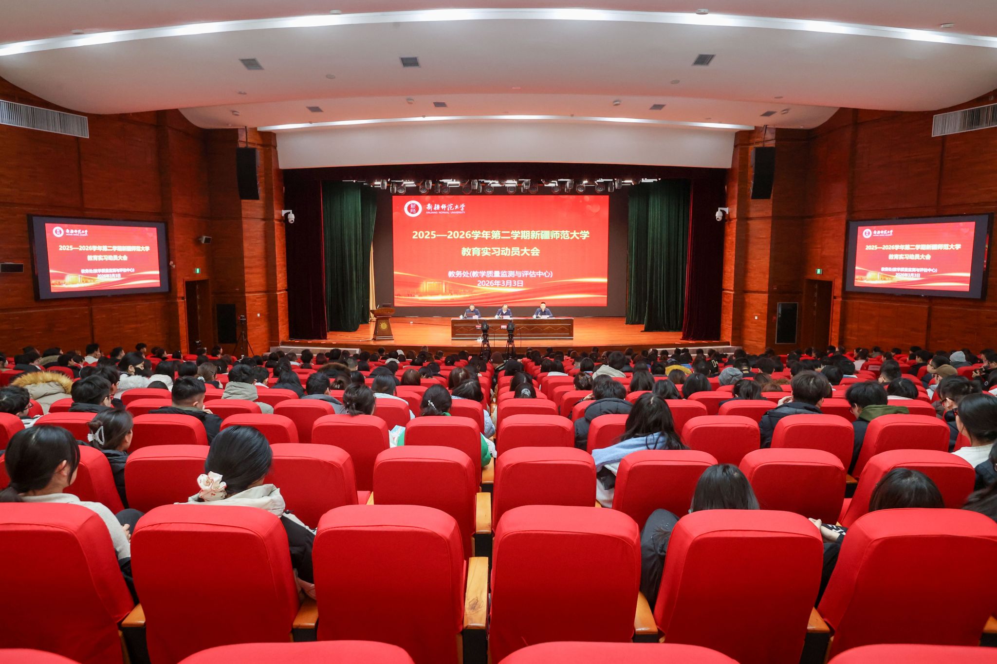 3月3日,我校2025—2026学年第二学期教育实习动员大会在温泉校区昆仑讲堂召开。校党委副书记、校长艾尼娃尔·艾克木参加动员大会并讲话。我校教育科学学院、中国语言文学学院、历史与社会学院等9个学院的教学副院长、实习支教指导教师、辅导员及学生代表近600人现场参会,其他师生通过“师苑直播”平台同步在线观看。学校教务处处长关文军主持大会。