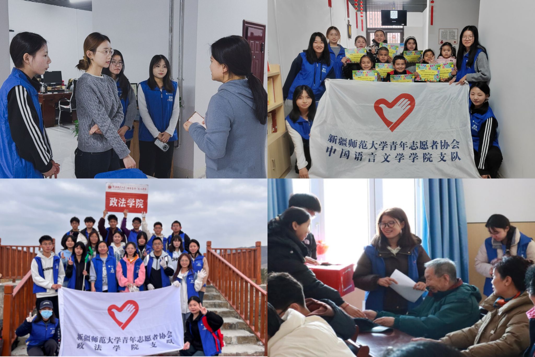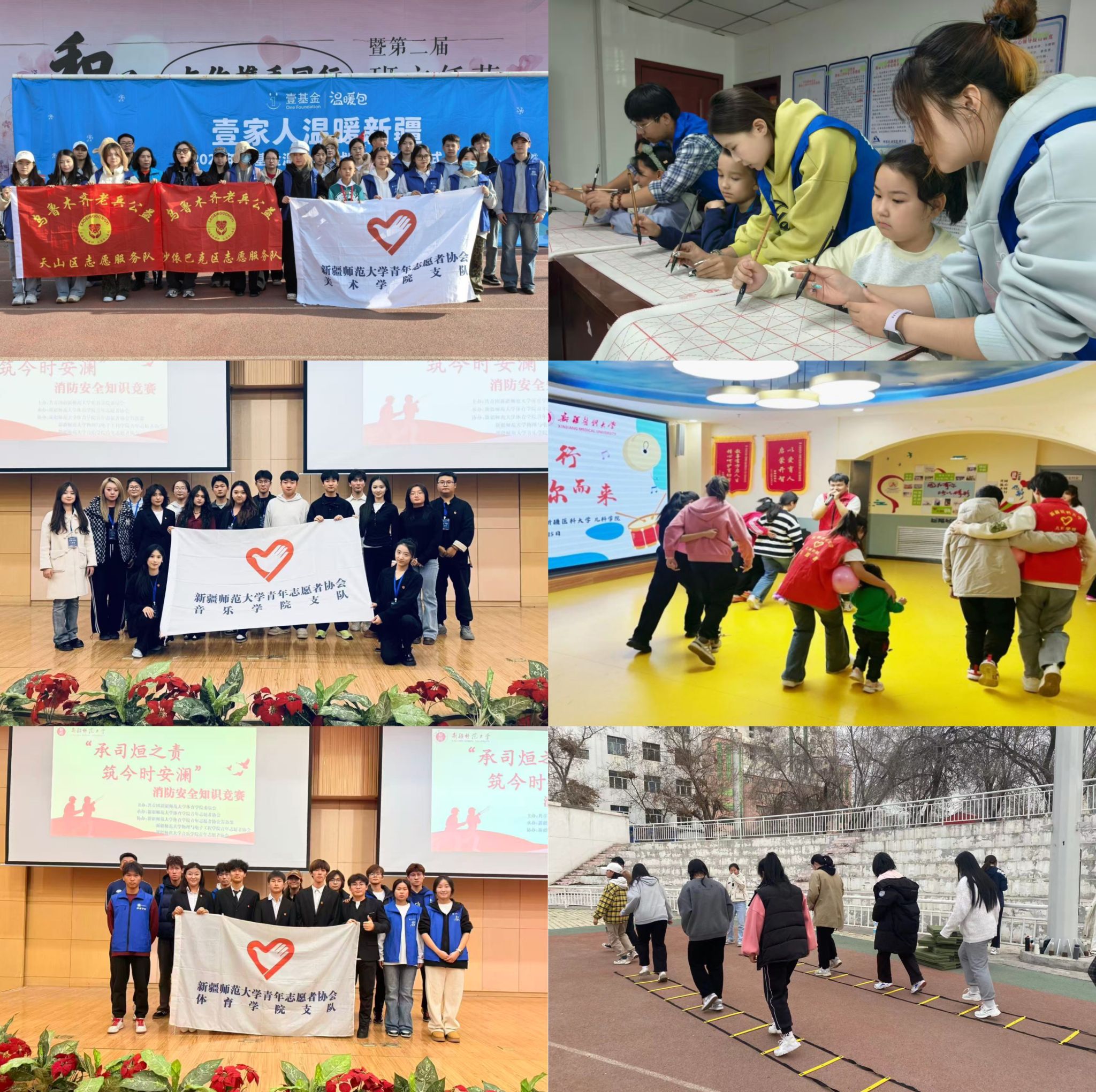 音乐学院青年志愿者组成“文艺轻骑兵”,走进基层开展文化志愿服务,在实践中铸牢中华民族共同体意识,以青春旋律谱写民族团结新篇章;体育学院开展关爱特殊儿童身体健康公益活动,完成健康检测、建立健康档案,用专业守护特殊儿童成长;美术学院在龙泉社区石榴籽服务站开展“墨润天山”书法探索之旅活动,面向老人与儿童系统教授软笔书法,以美育下沉社区助力文化润疆与民族团结。