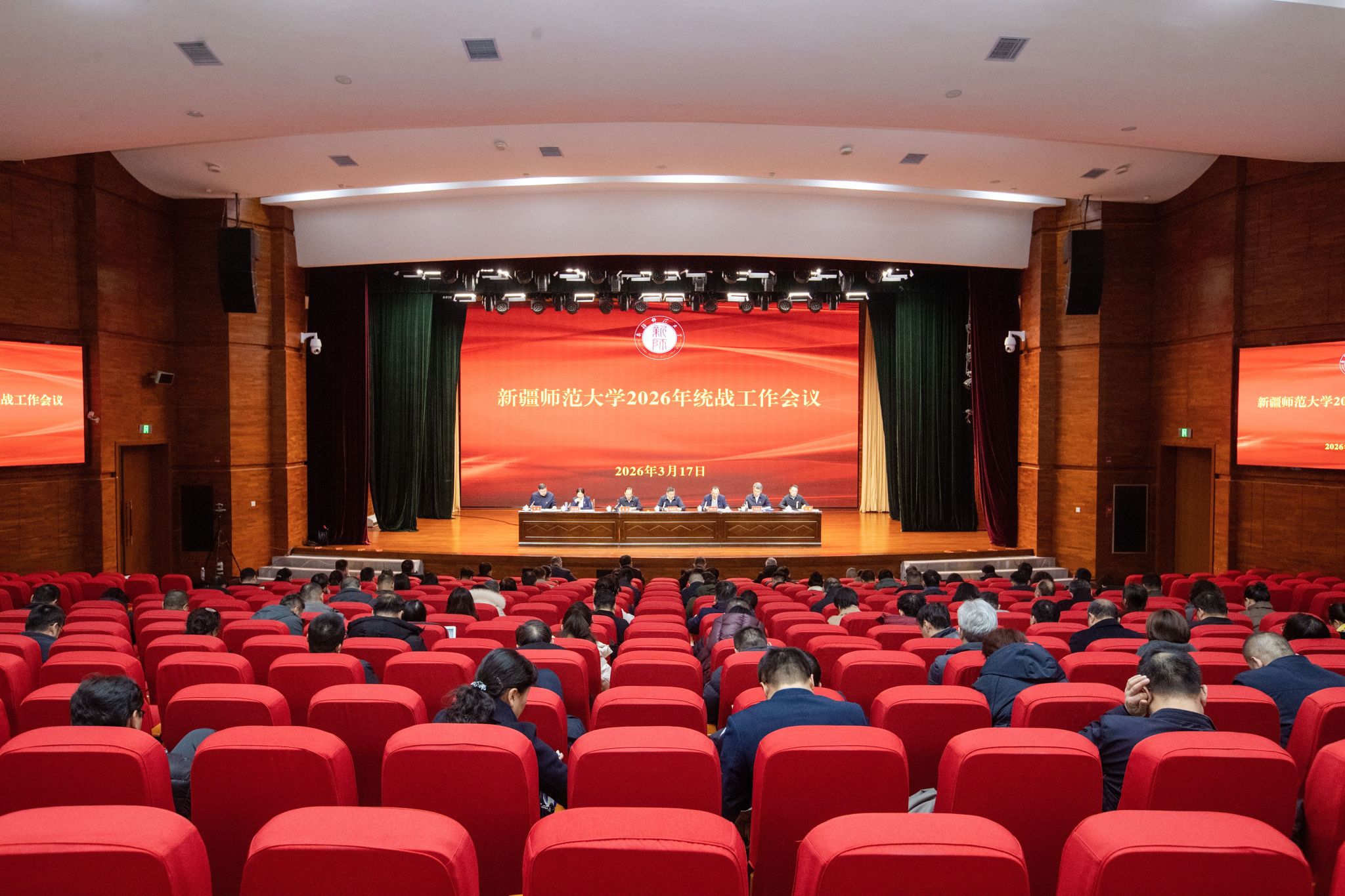 3月17日,新疆师范大学2026年统战工作会议在温泉校区昆仑讲堂召开。校党委书记蒋海军出席会议并讲话。全体在家校领导出席会议,会议由校党委副书记、校长艾尼娃尔・艾克木主持。