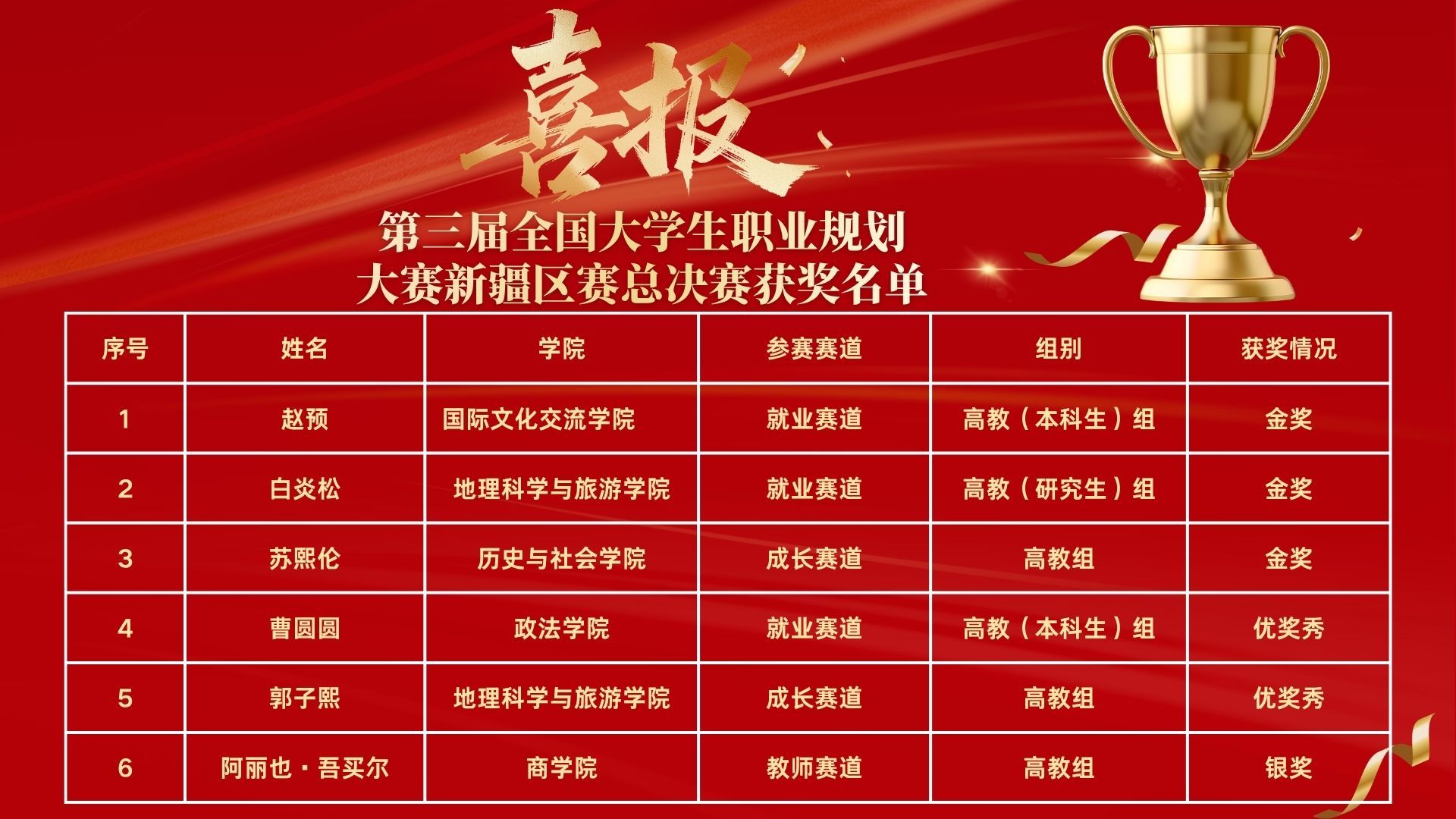 在备赛过程中,学校扎实开展职业生涯规划教育,引导广大学生树立正确的成才观和择业就业观。赛场上,参赛选手在生涯规划书展示及答辩等关键环节,充分展现了我校师生扎实的专业素养和过硬的职业综合能力。最终,我校国际文化交流学院赵预同学获就业赛道本科组金奖,地理科学与旅游学院白炎松同学获就业赛道研究生组金奖,历史与社会学院苏熙伦同学获成长赛道高教组金奖,商学院阿丽也·吾买尔老师获高教组课程教学赛道银奖,创造了6名参赛选手均获奖的佳绩,为学校赢得了荣誉。