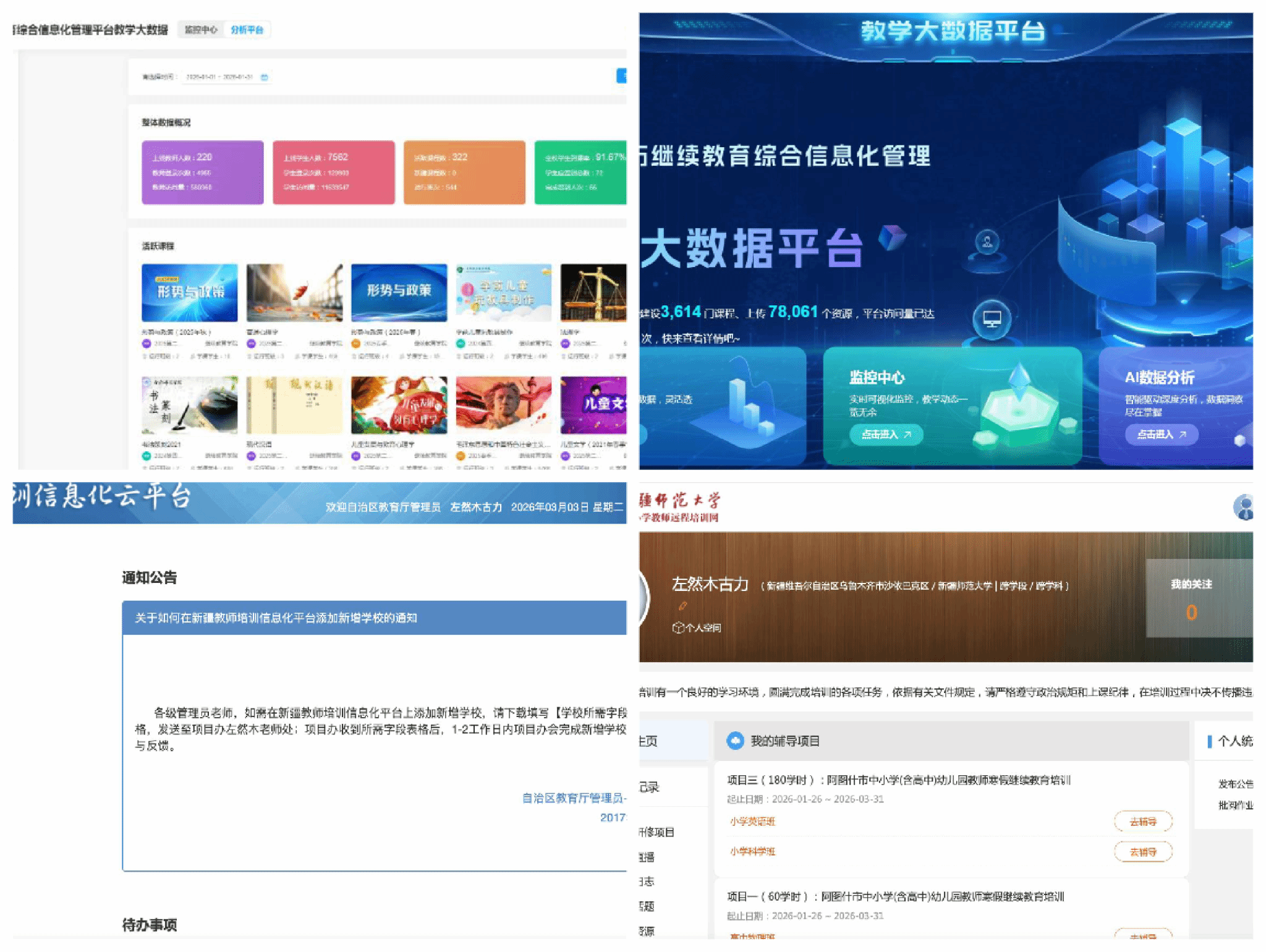 数智赋能,服务支撑体系迭代升级。学校锚定“智能+继续教育”发展方向,加快推进数字化学习服务平台建设,打通学习、管理、实训全链条服务。推动人工智能在学历继续教育管理全流程应用,聚焦个性化、互动化、智能化,分层分类建设本土课程资源库及专业技能训练小微课程;迭代升级“新师网络在线学习平台”“新疆教师培训信息化管理平台”,构建教、学、研、训、评、管一体化功能体系,实现流程显性化、程序化、工具化与专业化的优质教师在线课程资源数据库与学习平台,推动教师自主选学全面落地。累计建设优质在线课程资源21门,数字化办学能力显著增强。科研创新能力稳步提升,立足继续教育科研平台建设,强化科研队伍培育,以科研创新赋能内涵发展。获批中国高等教育学会、自治区教育厅科研课题3项;荣获各级教学成果奖6项;起草制定的规划、方案、规章制度被省级部门采纳1项、厅局级部门采纳6项;5个项目入选各级各类教育教学改革典型案例和重点项目,其中1个案例入选教育部“国培计划”优秀典型工作案例,1项任务入选教育部学习型社会建设重点任务,1个项目入选《中国教师培训发展报告(2021)》,科研引领发展、服务决策的作用持续凸显。