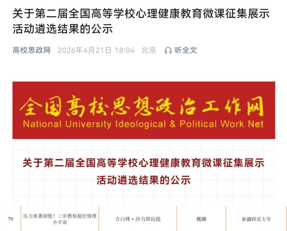 学校高度重视此项活动,2025年,学校党委学生工作部心理健康教育服务中心面向全校开展了第二届心理健康教育微课征集展示活动,共征集到来自全校18个学院的36个师生作品。经校内评选、公示及重点打磨后择优推荐参加全国评选。最终,由我校中国语言文学学院研究生吉白缂·沙力塔拉提带来的作品脱颖而出,成功入选。