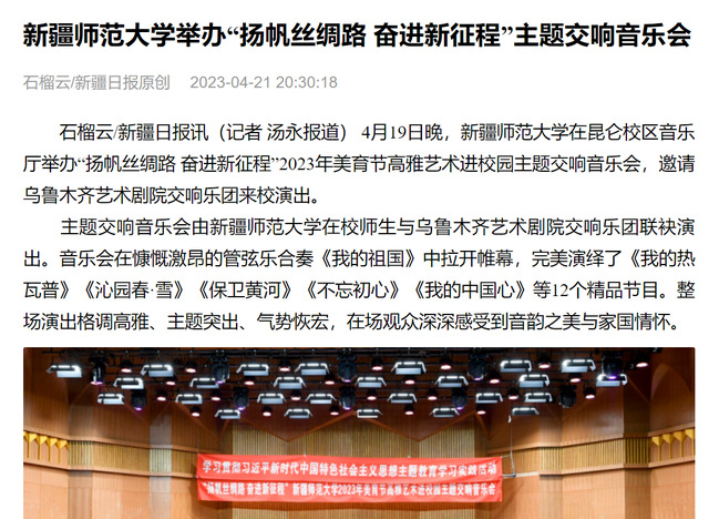 石榴云/新疆日报讯(记者 汤永报道) 4月19日晚,新疆师范大学在昆仑校区音乐厅举办“扬帆丝绸路 奋进新征程”2023年美育节高雅艺术进校园主题交响音乐会,邀请乌鲁木齐艺术剧院交响乐团来校演出。
