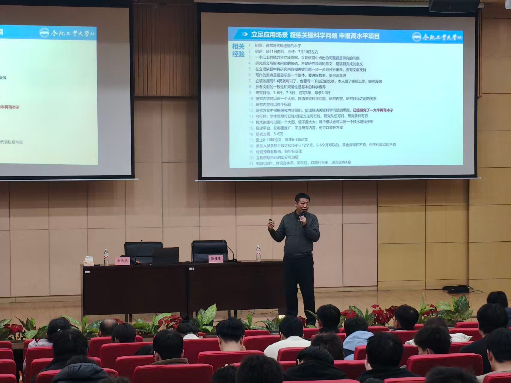 吴共庆教授紧密围绕报告主题展开分享。他指出,研究生教育的核心在于科研能力的系统培养,而高水平科研项目是达成该目标的重要载体。结合自身丰富的科研管理及项目申报经验,吴共庆教授系统阐述了如何从实际应用场景中精准凝练关键科学问题。在项目申报指导部分,他重点强调了选题应遵循科学性、创新性与可行性,并对摘要撰写、立项依据论证、研究内容设计等关键环节进行了深入剖析。通过具体案例,吴共庆教授生动展示了如何以严谨的逻辑和扎实的工作提升项目申报质量,并鼓励师生注重长期积累、持续打磨,最终实现科研能力跃升与高水平成果产出的良性循环。