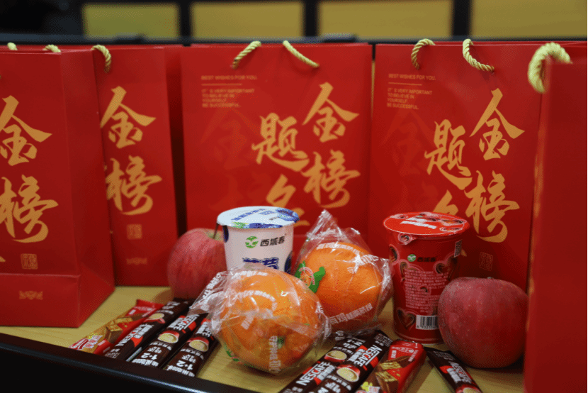 活动现场,学院为备考学生准备了一份份凝聚着满满关怀和祝福的福袋。橙子象征“心想事橙”,祝愿学子心愿顺遂、梦想成真;苹果代表“苹安上岸”,期许大家备考顺利、从容应考;咖啡寓意“提神醒脑”,助力大家保持专注、高效备考;脆脆鲨则“鲨出重围”,鼓励大家突破难关、脱颖而出;酸奶象征“酸苦尽甘”,祝福大家熬过备考艰辛、收获成功的甘甜。