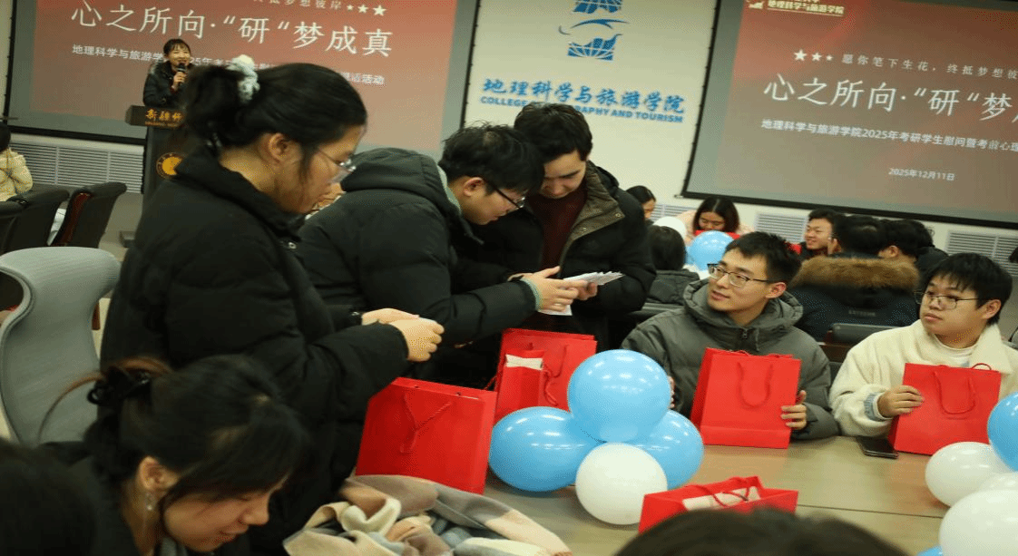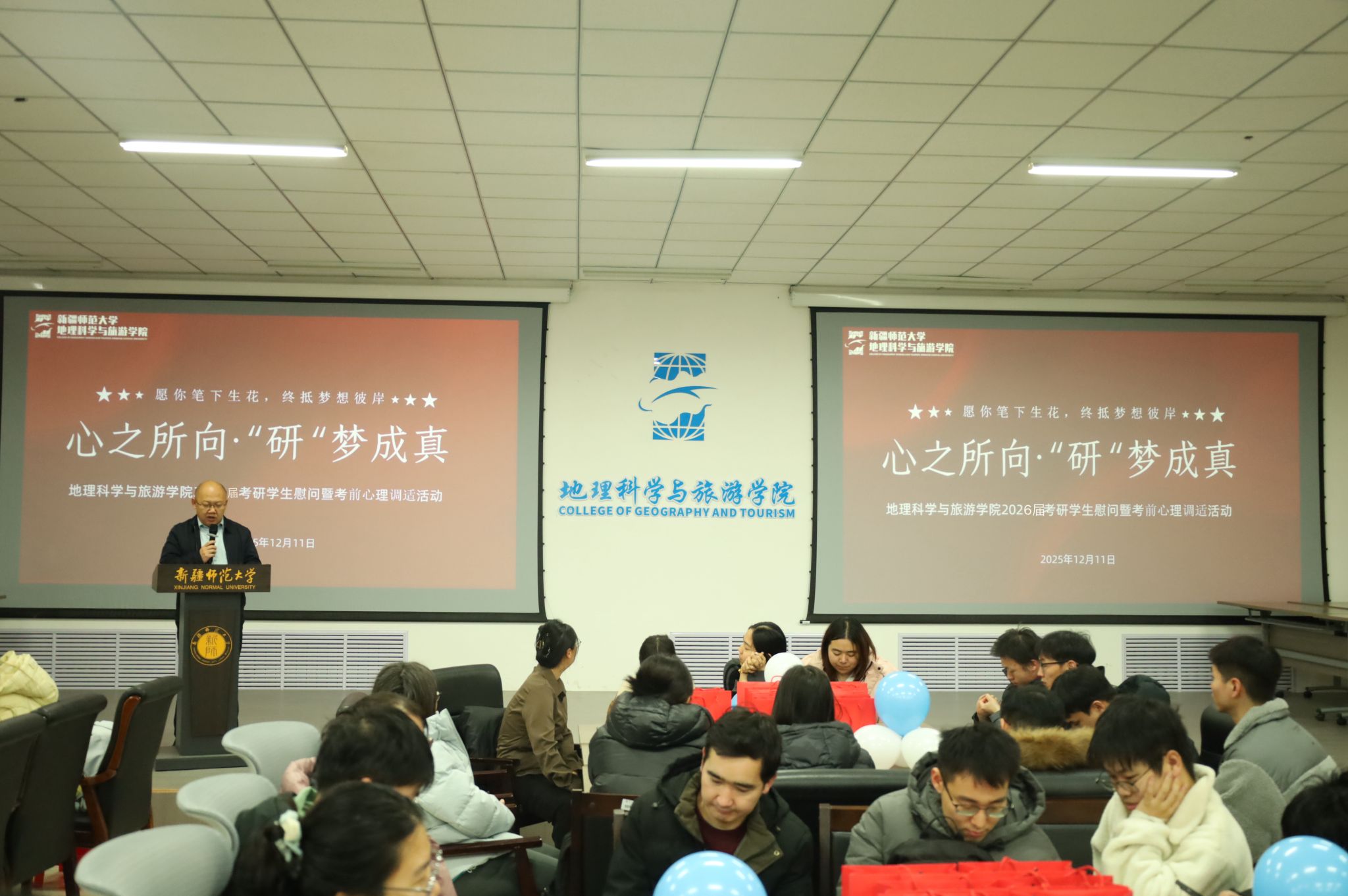 在2026年全国硕士研究生招生考试进入冲刺倒计时之际,为助力考研学生坚定信心、缓解备考压力、提振迎考信心,12月11日,我校地理科学与旅游学院举办2026届考研学生慰问暨考前心理调试活动。学院全体领导班子、系主任和2022级班主任、辅导员与百名考研学生齐聚经纬讲堂,送上暖心鼓励与祝福关爱。