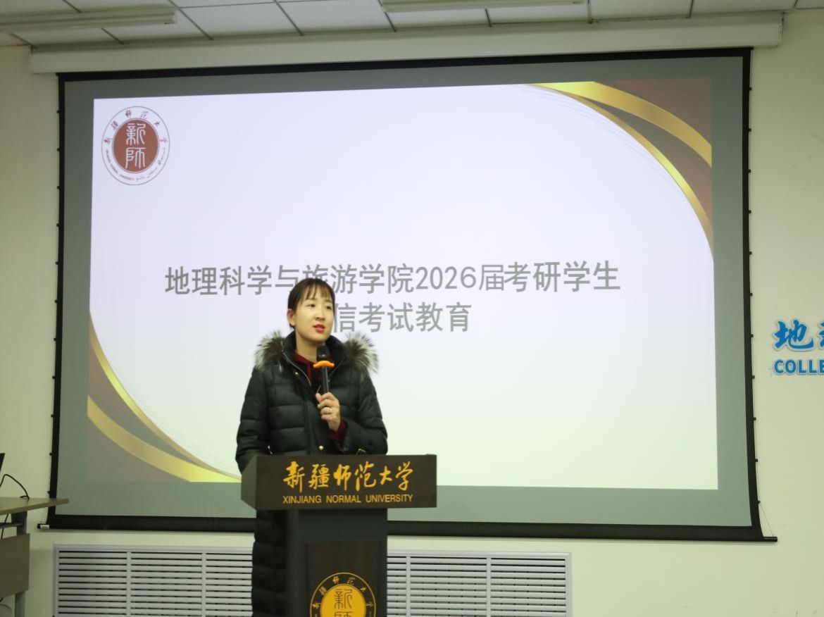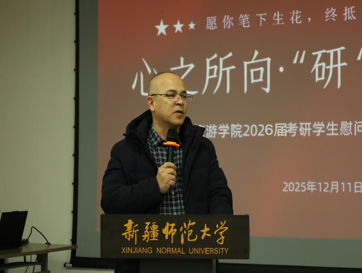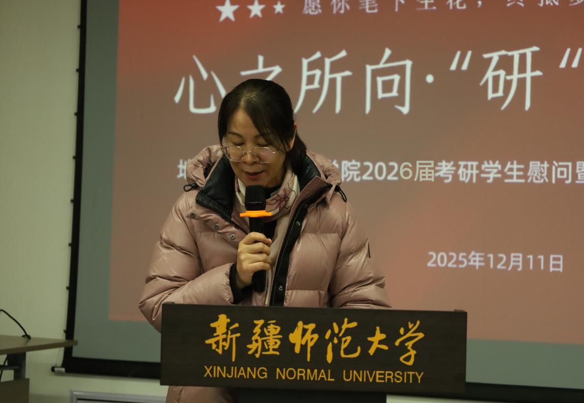 活动伊始,我校地理科学与旅游学院党委书记闫政远为考研学子送上诚挚祝福并寄予殷切期望,肯定了同学们在备考路上的执着坚守与不懈付出,嘱咐大家要科学复习,合理规划时间,提高备考效率;要劳逸结合,适当放松心情,以健康体魄和良好心态应对考试;要坚定信心,相信自己付出有回报,不轻言放弃。学院党委副书记、纪委书记高丽倩进行诚信考试教育,通过文件解读、警示教育等方式,提醒同学们要端正考风、严肃考纪,筑牢诚信考试思想防线。学院副院长阿里木江·卡斯木针对备考阶段的时间管理、重难点突破、考试准备等关键环节为同学们分享实用备考策略,鼓励大家坚定目标、科学备考、全力冲刺。2022级班主任代表王雪梅寄语同学们冲刺之际要聚焦重点、查漏补缺、调整心态,鼓励大家“与压力共生,与同伴并肩”,在相互帮助相互鼓励中凝聚奋进力量。