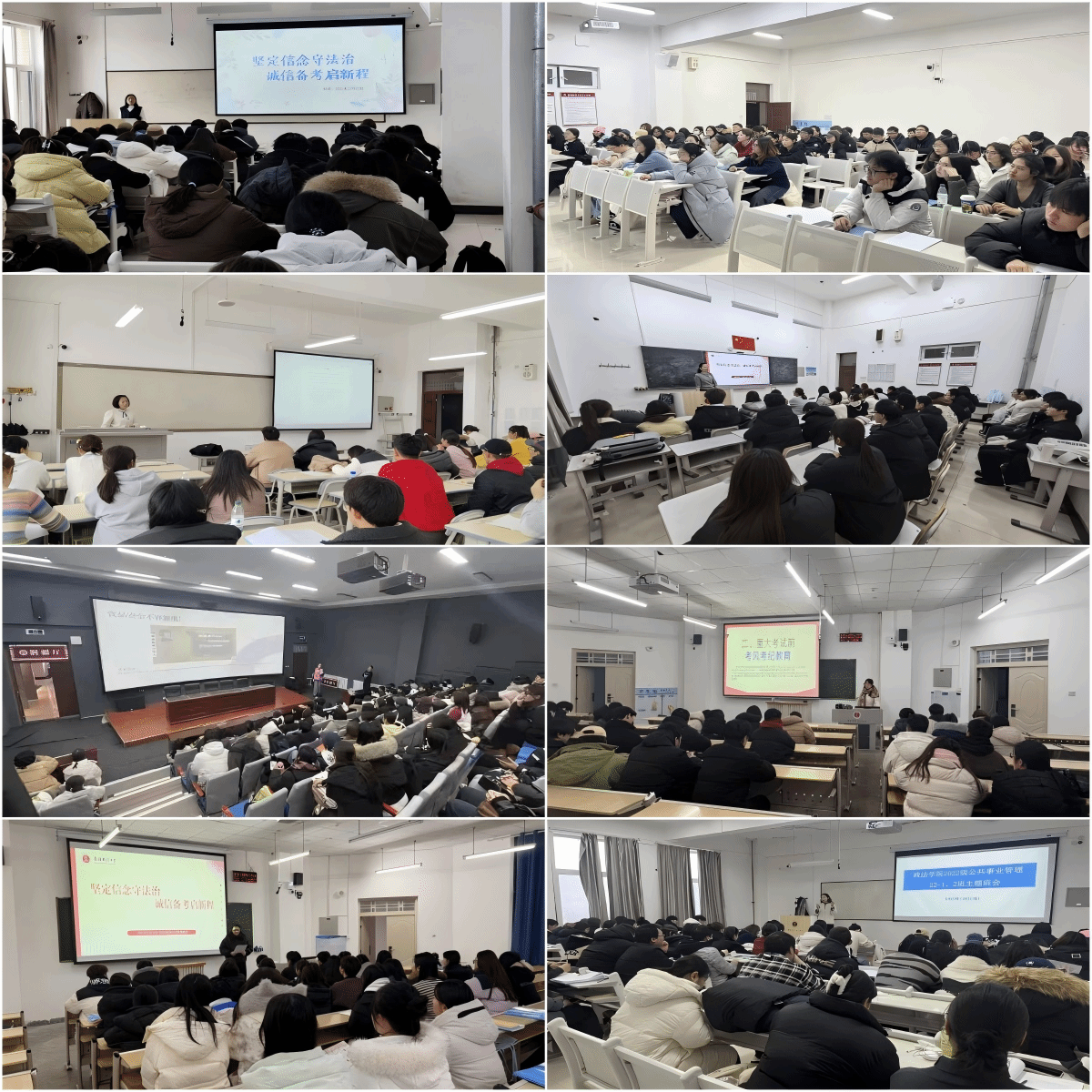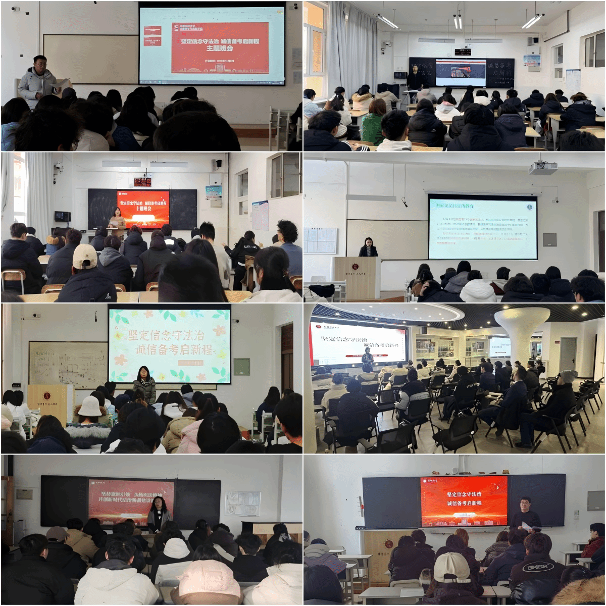 为持续深化学生理想信念教育,弘扬宪法精神,夯实意识形态底线,营造诚信考试氛围,我校于12月开展了“坚定信念守法治 诚信备考启新程”主题班会,本科生、研究生全员参与。
