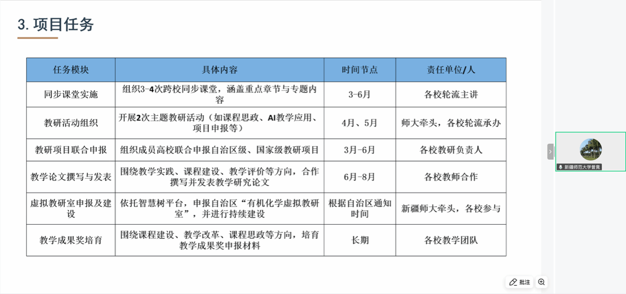 围绕项目目标,活动明确了六大实施任务:一是3-8月组织3-4次跨校同步课堂,由四校轮流主讲,覆盖核心章节与专题;二是4-5月开展常态化线上教研活动,由各校骨干教师分享优势领域教学经验;三是联合申报自治区级、国家级教研项目,抢抓申报窗口期推进合作;四是8月前围绕教研主题撰写并发表高质量教学论文;五是依托项目共同体申报并建设自治区级有机化学虚拟教研室;六是长期培育教学成果奖,推动教学成果的推广与应用。