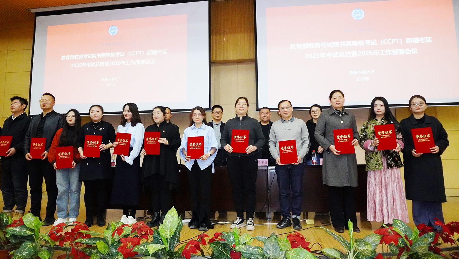 会议系统总结2025年度书画等级考试新疆考区组织实施情况,传达教育部教育考试院关于2026年考试工作最新精神与要求,部署2026年度新疆考区考试报名、考务管理、安全保密等重点工作。会议对2025年度优秀单位及个人进行了表彰,并交流了考试组织与美育教学经验。