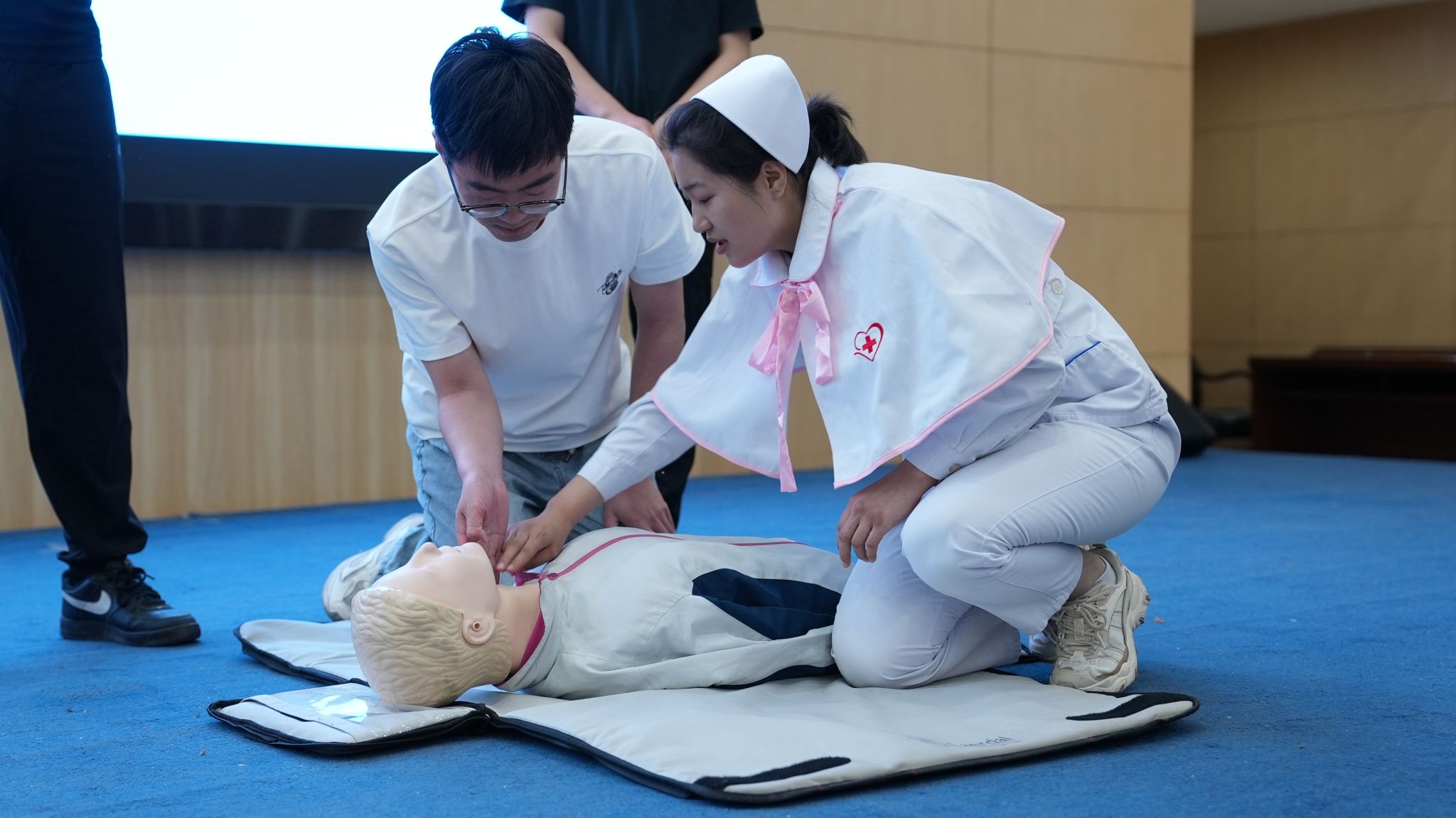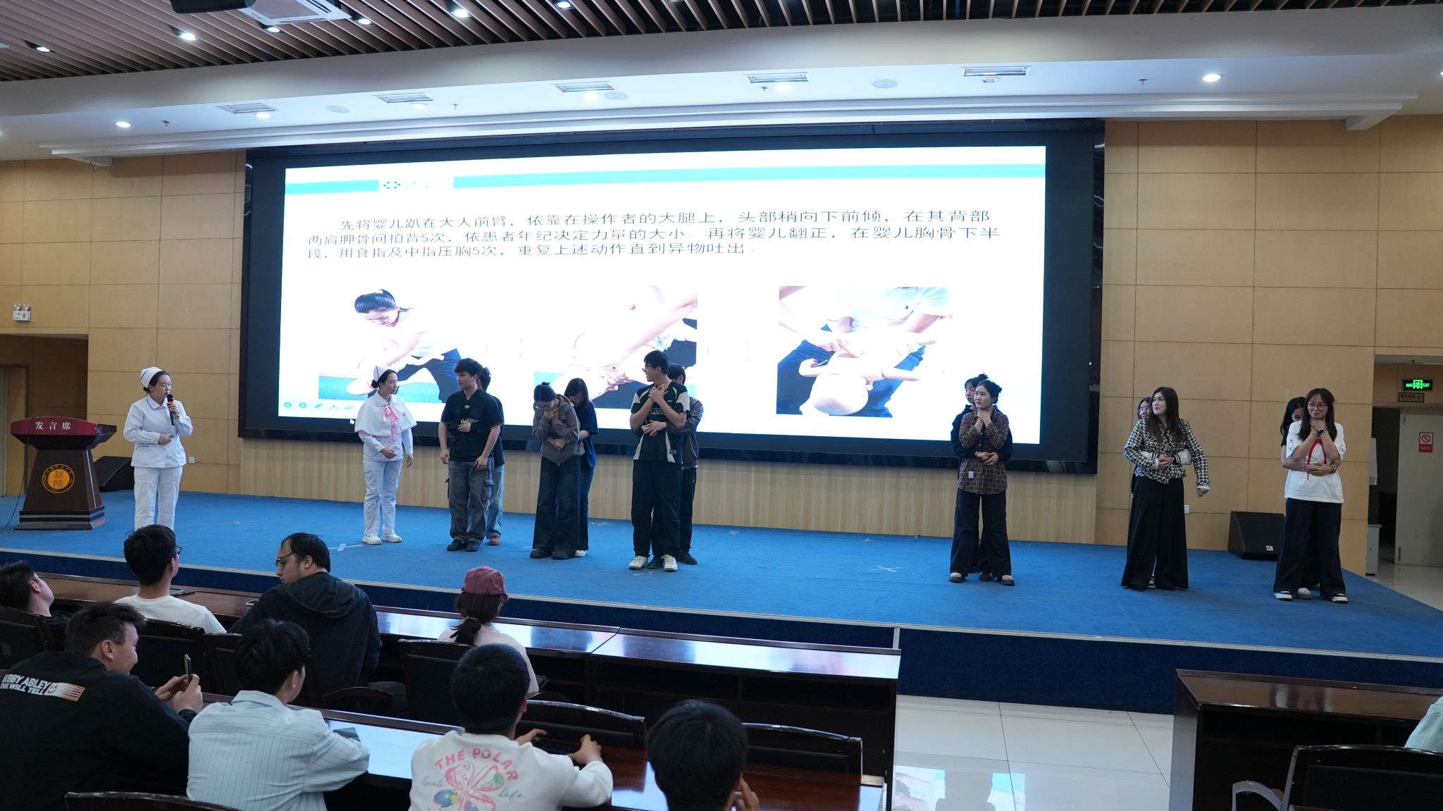 急救专题讲座中医护人员为师生示范急救措施