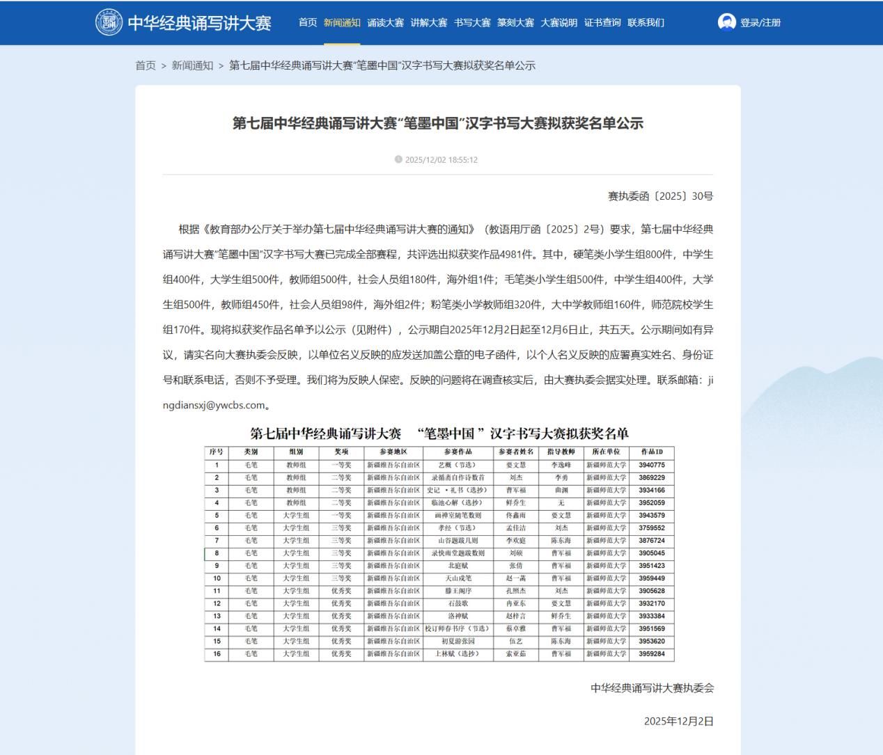 在教育部主办的“第七届中华经典诵写讲大赛‘笔墨中国’汉字书写大赛”中,我校美术学院教师团队实现新疆高校在该赛事一等奖领域的历史性突破,构建“1金3银”的高等级奖项梯队。要文慧老师凭借对汉字笔法的精准把控和文化内涵的深刻诠释,一举夺得教师组一等奖,成为新疆地区唯一获此殊荣的高校教师。曹军福、刘杰、鲜乔生老师同步斩获教师组二等奖,形成“头部引领、梯队支撑”的教师实力格局,充分体现学院在书法创作与传统文化传承领域的深厚师资积淀。学生群体同样表现亮眼,13名参赛学生全部获奖,实现一等奖到优秀奖的全等级覆盖,展现出人才培养体系对学生专业能力的高效塑造力。